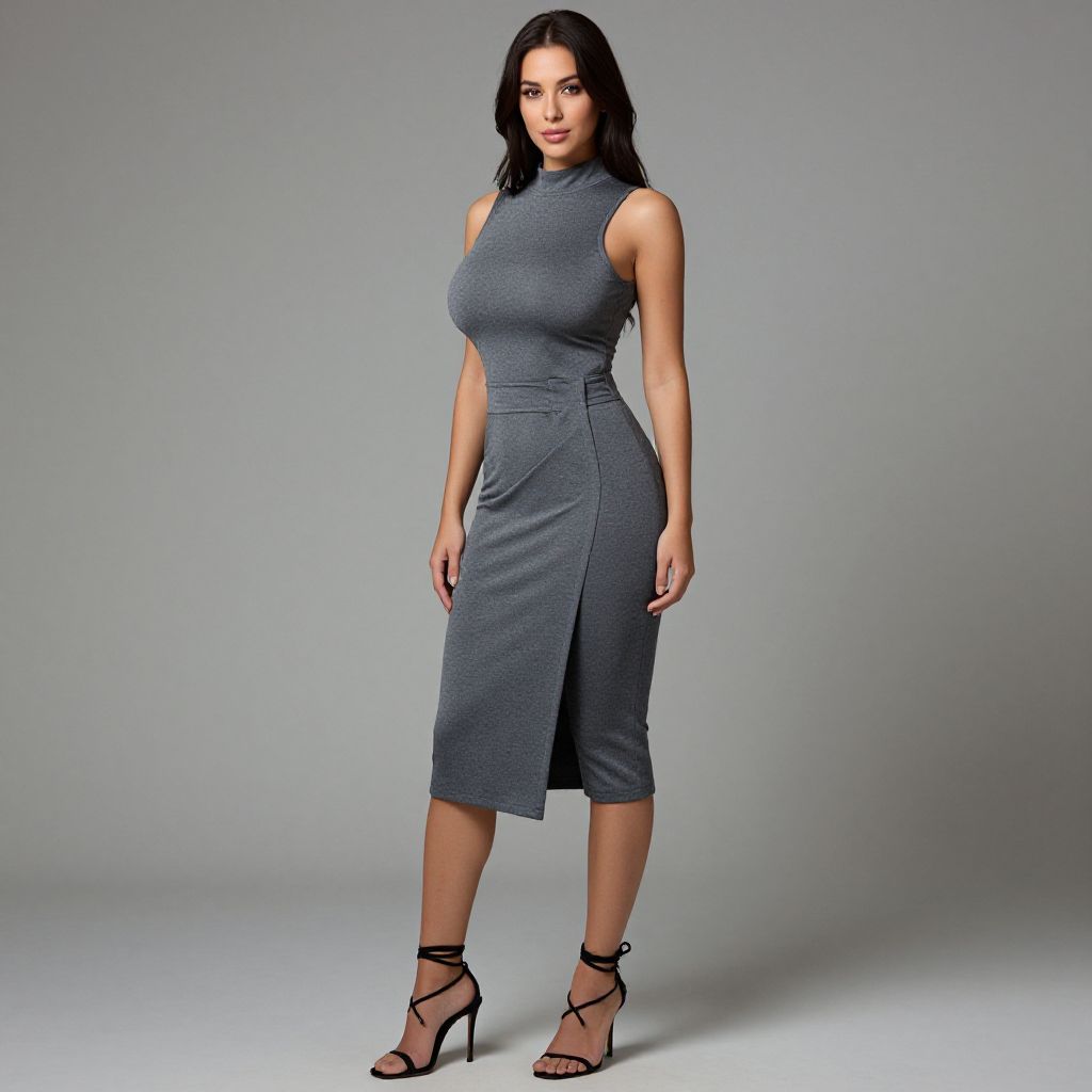 "Woman, chic, heather grey sleeveless dress with a high neck and wrap-style skirt, asymmetric hemline, calf-length, cutaway shoulders, strappy black high heels with lace-up detail around the ankles.. Sexy. Pretty face and beаutiful eyes. Big breasts."