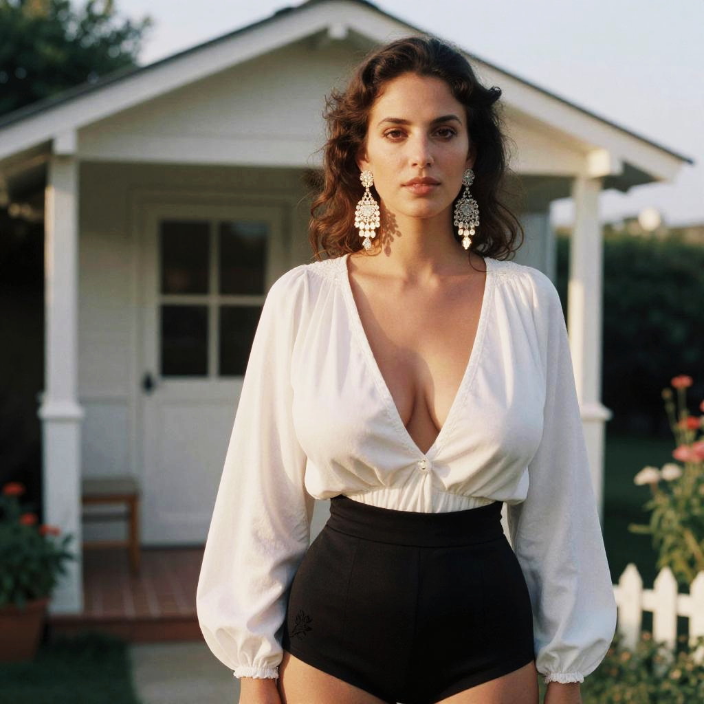 A petite woman in an elegant white blouse with a deep V-neck and chic black shorts stands at a seaside cottage with a garden, captured in the warm tones of 3M analog film stock. Chandelier earrings glimmer softly in the sunlight. Sexy. Pretty face and beаutiful eyes. Big breasts