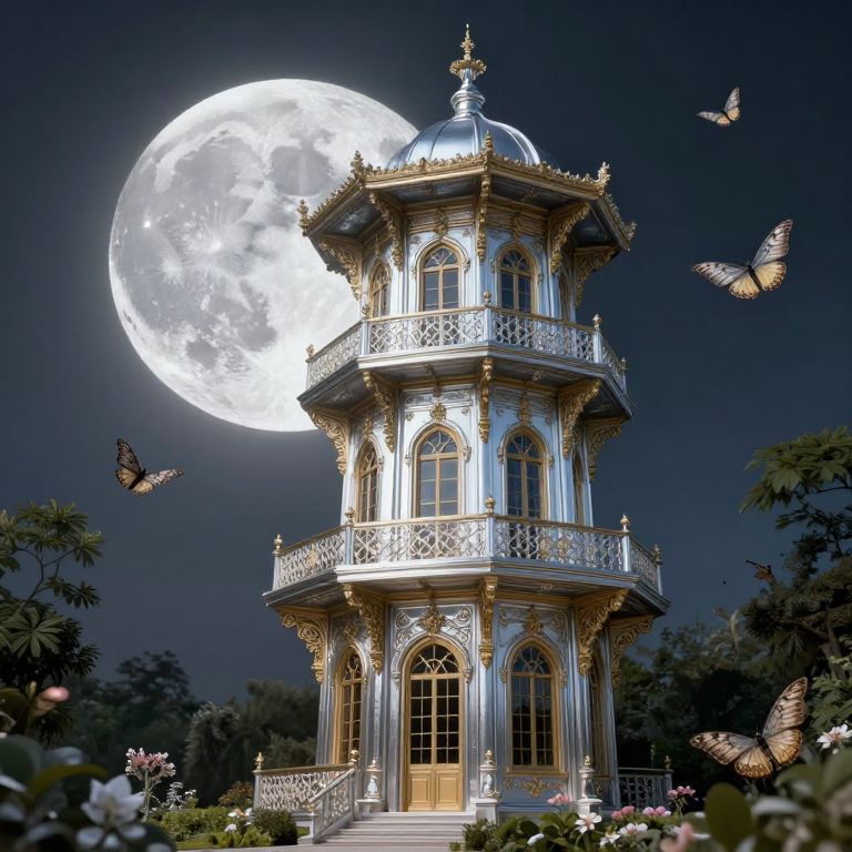 A vivid digital illustration of an ornate, silver Victorian-style gazebo with gold accents, standing under a bright, full moon. The gazebo features intricate balconies, arched windows, and a domed roof. Surrounding the gazebo are fluttering, detailed butterflies with orange and black wings. The background showcases a dark, starless night sky, and the foreground includes lush greenery and blooming flowers. The moon's glow illuminates the gazebo, creating a magical, ethereal atmosphere. The overall style is highly detailed and fantastical, with a focus on romantic and whimsical elements.