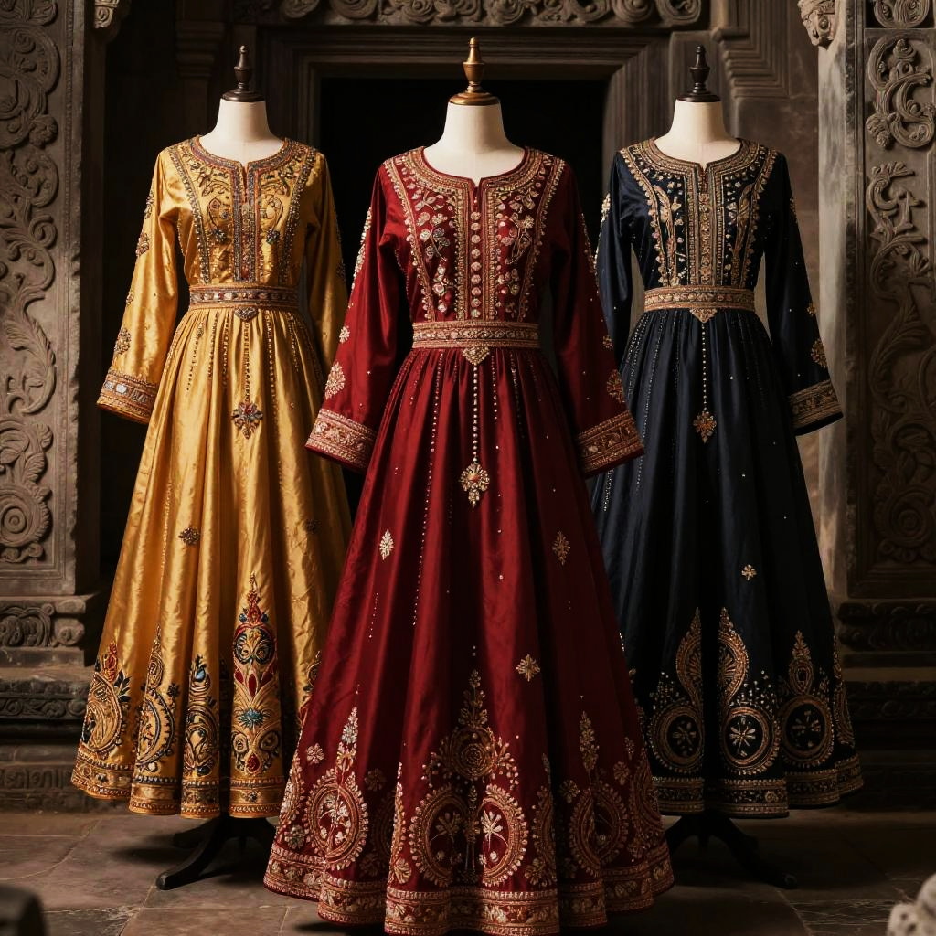 Vestidos embroidered with traditional motifs, cultural fusion design, rich fabric textures in deep reds and golds, dramatic lighting emphasizing intricate patterns, set in an ancient temple with stone carvings, mystical and elegant vibe.