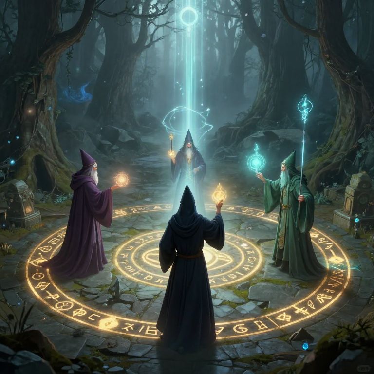 Digital fantasy artwork: Four hooded wizards in dark robes, casting glowing spells around a mystical, glowing runes circle in a misty forest. Bright blue