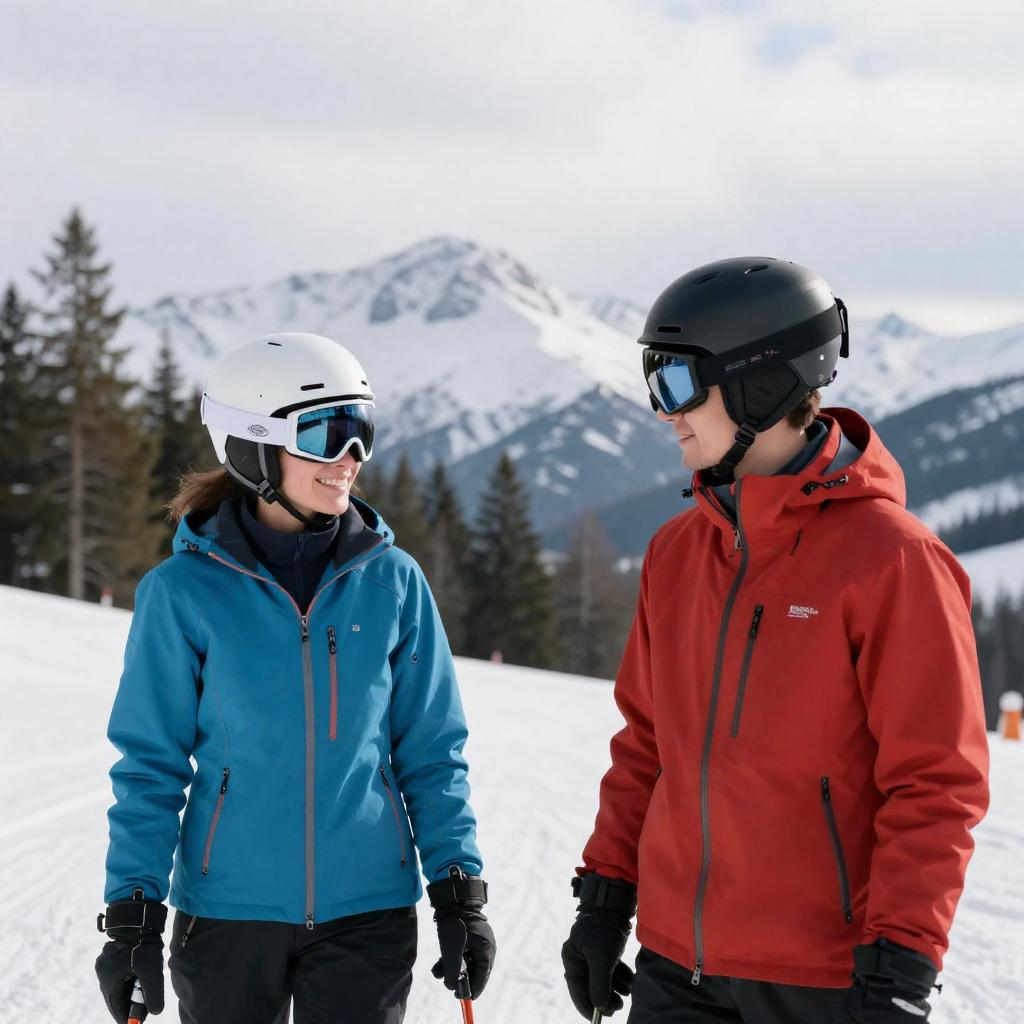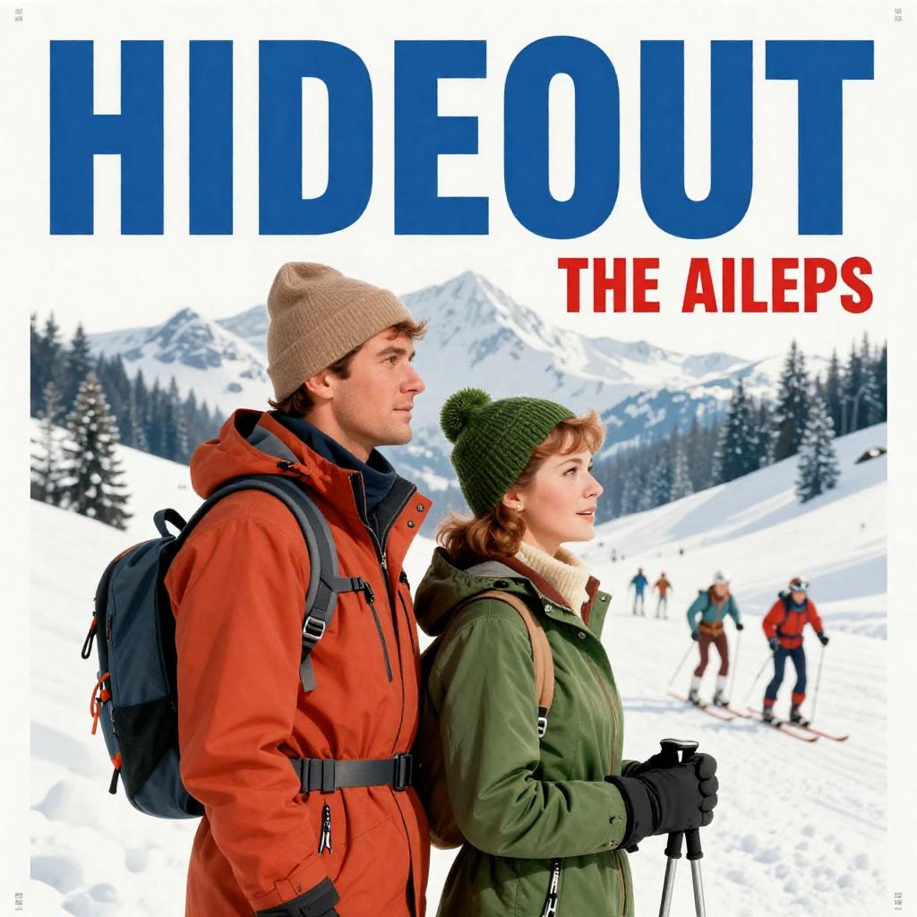 Vintage movie poster for "Hideout in the Alps" featuring a man and woman in winter gear, standing side by side, gazing at a snowy mountain scene with skiers. The man wears a beige hat and jacket, the woman a green hat and coat. Bold blue and red overlays the image.