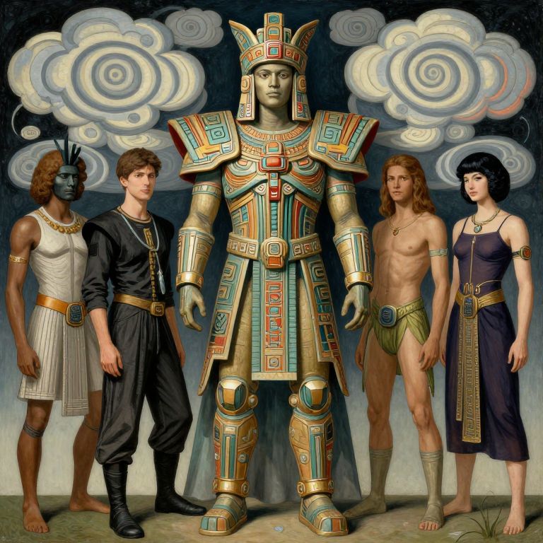 This digital painting depicts a group of five ancient Egyptian-style figures against a cloudy background. Central is a statuesque, armored figure with a golden, intricately patterned headdress and robe, standing tall and imposing. Flanking him are four individuals: a black-skinned woman in a white, pleated dress with a black headdress; a fair-skinned, curly-haired man in black pants and a dark shirt with a gold necklace; a shirtless, fair-skinned man with long hair, wearing a green loincloth and sandals; and a dark-haired woman in a purple dress with gold accents and a black headdress. The figures stand barefoot on a grassy ground. The artwork blends realism with stylized ancient Egyptian aesthetics.