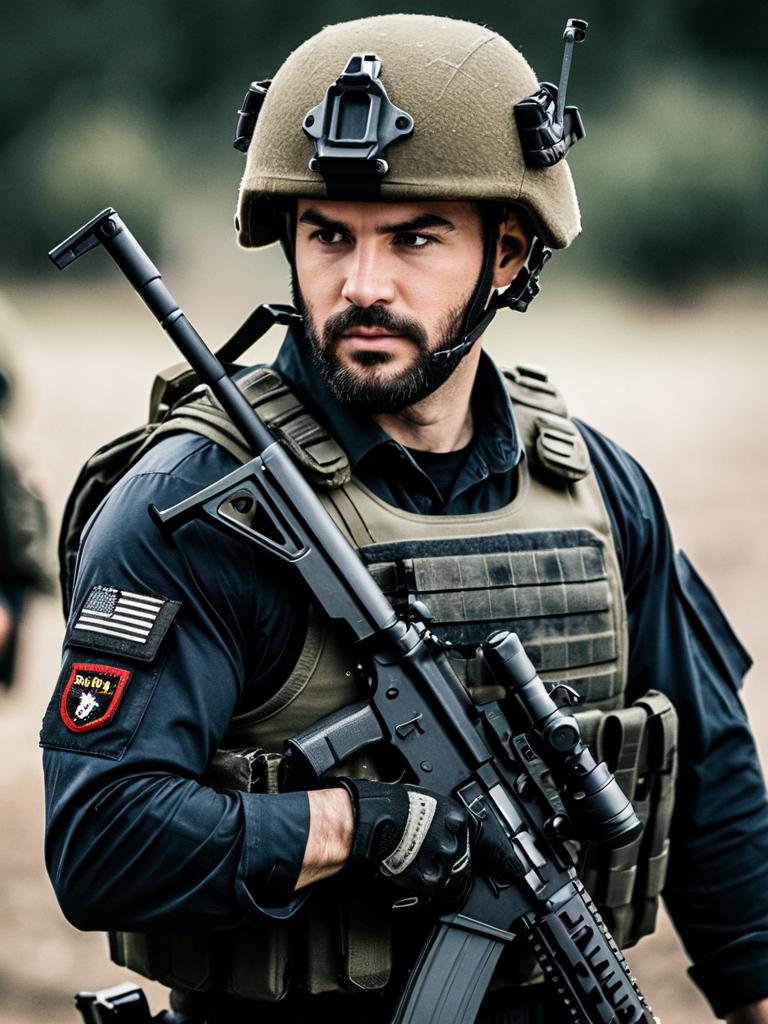 Male tactical outfit, 1boy, male focus, weapon, gun, helmet, solo, realistic, facial hair, rifle, assault rifle, blurry background, blurry, military, load bearing vest, bulletproof vest, upper body, gloves, holding, uniform