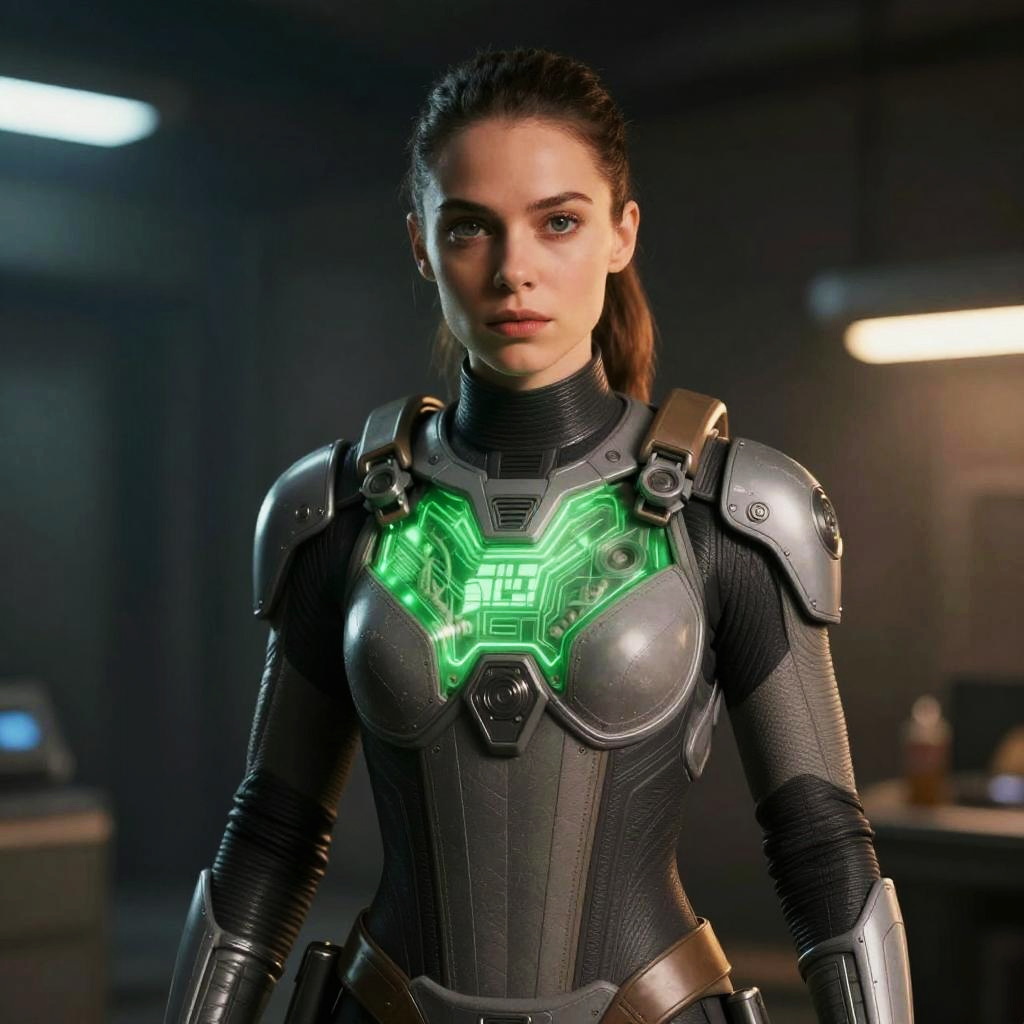 Ripley Alien, woman in a futuristic suit with a green chest
