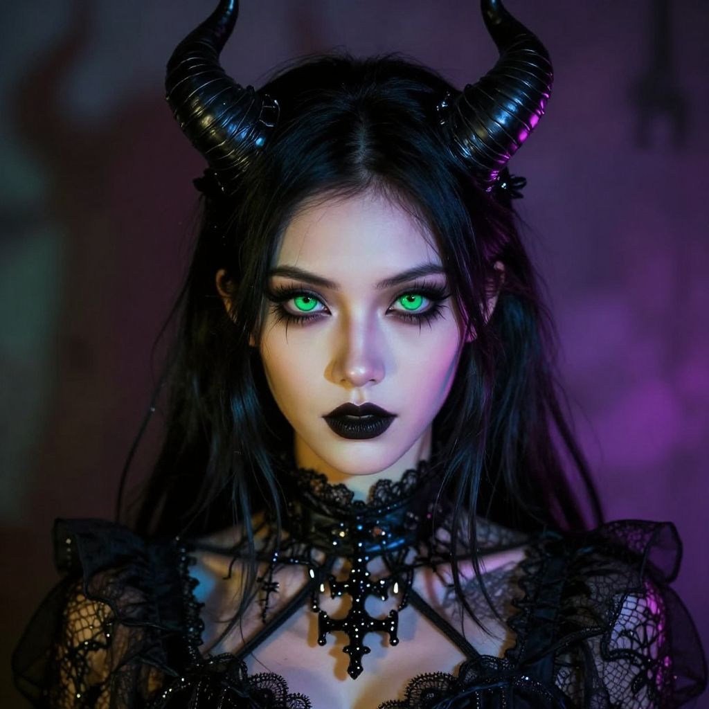 Photograph of a pale-skinned woman with striking green eyes and black lipstick, wearing black, horned headpiece, and intricate black lace choker with beads. Her long, straight black hair frames her face, which is illuminated by blue and purple lights. She is dressed in a black lace top. The background is dark and blurred, emphasizing her glowing eyes and gothic-inspired attire. The image has a fantasy, supernatural vibe. Her expression is intense and mysterious, adding to the overall eerie and enchanting aesthetic.