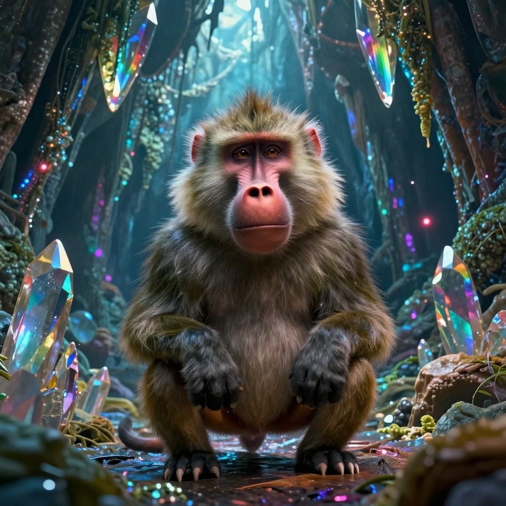 Pixar, animation, realism, (epic:1.2), realistic, trending on artstation, 3d, (high quality:1.2), (masterpiece:1.2), high details, incredibly absurdres, colorful), photograph, film, best quality, highres, (Full shot), (no humans:1.2), tan, dark green, Baboon, (crystal cavern with rainbow reflections)