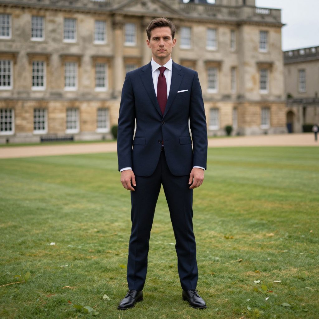 "a man, tailored navy suit, crisp white dress shirt, deep burgundy silk tie, polished black leather oxford shoes, historic stone building, grand columns, lush green lawns, Holga camera style, soft focus, warm tones, confident expression. Man has masculine face and piercing eyes"