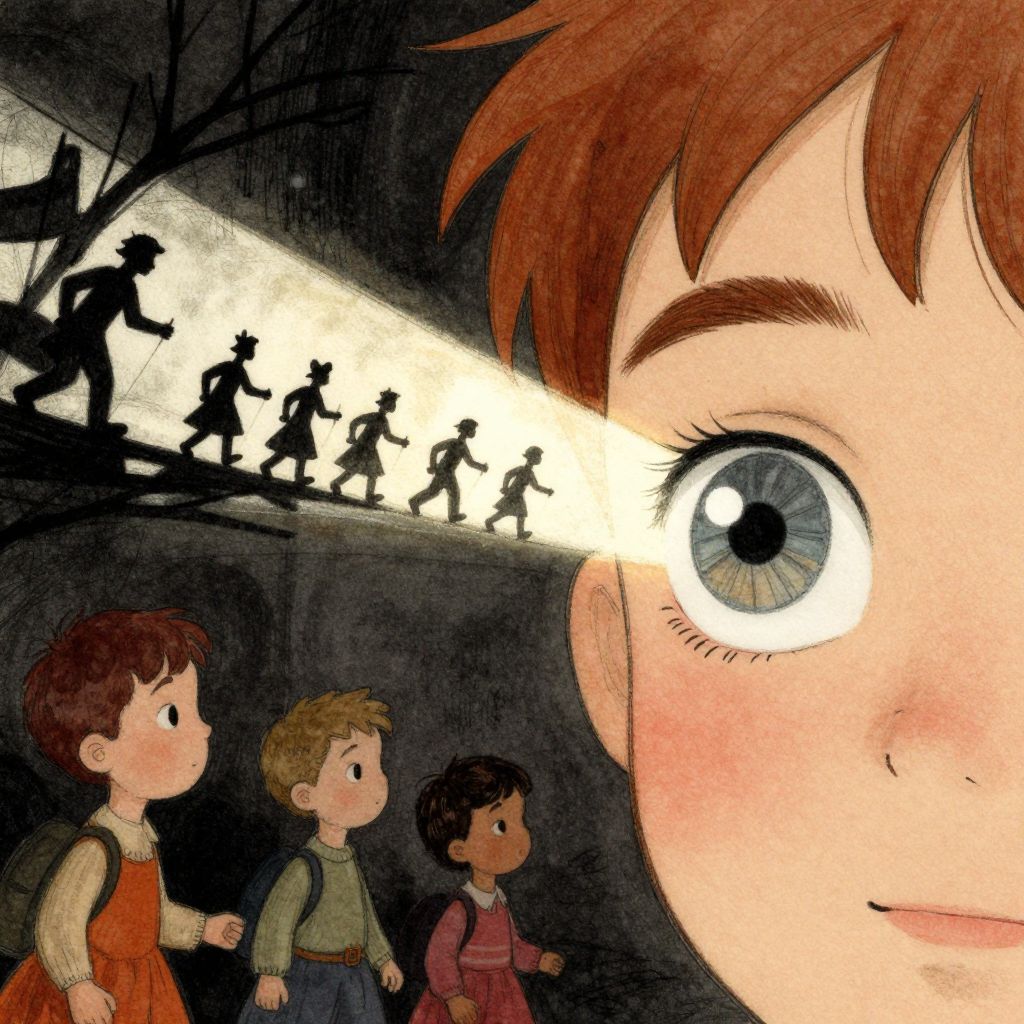 Create a beautifully detailed drawing capturing a fantastical world infused with nostalgia and shadowy intrigue, The style features clean, confident outlines with soft watercolor washes, balancing warmth and accessibility with intricate detail, The palette contrasts muted tones—warm ochres, soft reds, creamy whites—with stark, inky blacks, creating a dramatic interplay of light and shadow that evokes both innocence and mystery, The atmosphere blends vintage children’s book charm with an eerie undertone, as if balanced between reality and a shadowy dreamscape, Characters should have naturalistic proportions and subtle expressiveness, their features gently exaggerated to reflect curiosity, resilience, or vulnerability, Dynamic shadow puppet figures may emerge in the background, their silhouettes adding to the narrative and reinforcing the duality of light and shadow, The focus will be on a specific subject—In a field of tall, swaying grasses, Henry notices shadow flowers growing beside the real ones, their dark shapes faintly outlined in silver, When the wind blows, the shadows ripple unnaturally, whispering secrets that only the night can hear—carefully integrated into the scene, The composition is grounded yet surreal, seamlessly merging whimsical simplicity with haunting, thought-provoking detail to invite wonder and introspection
