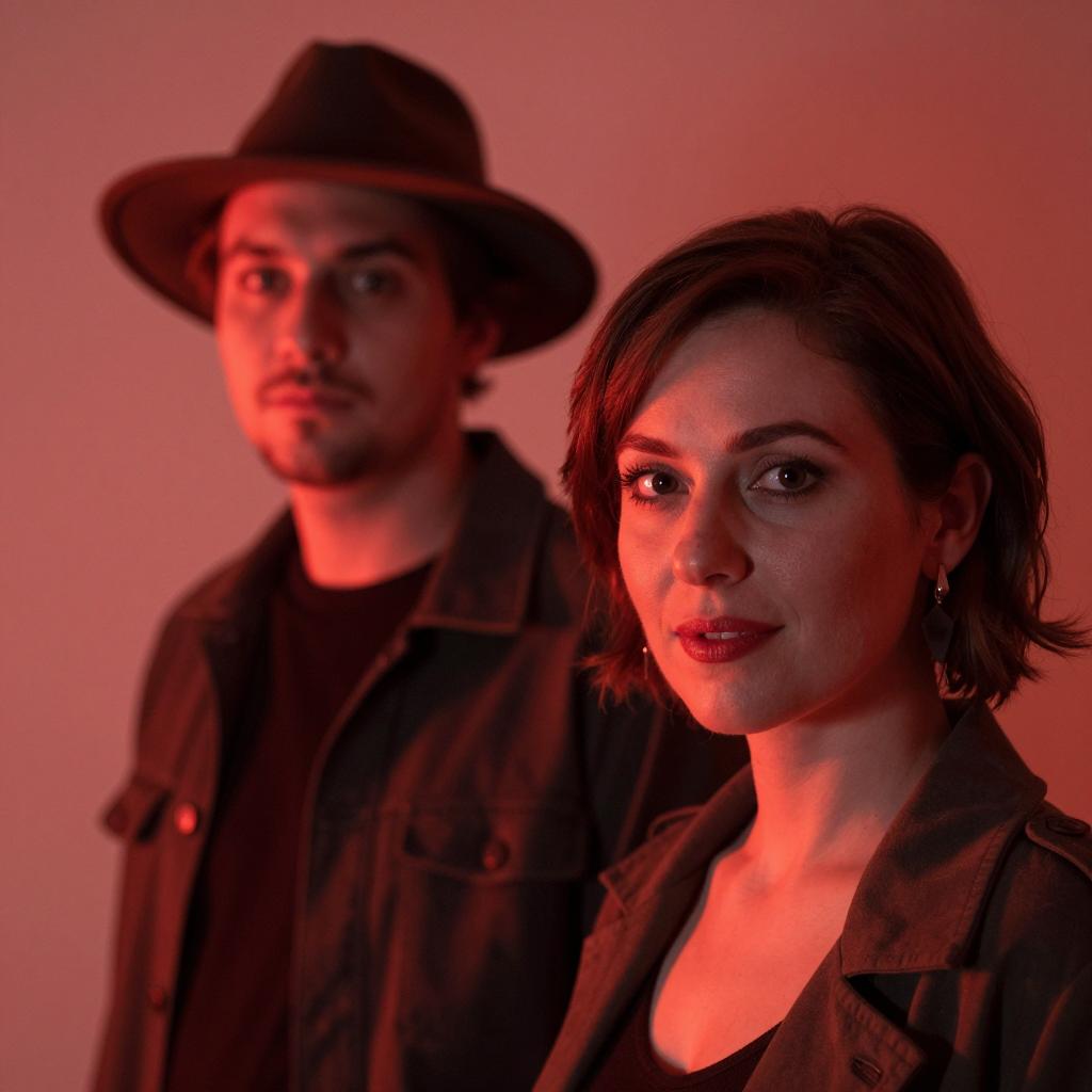Photograph of two people in a red-lit room. Foreground woman with short brown hair, earrings, smiling slightly. Background man in a hat and jacket, slightly blurred. Both looking towards the camera. Warm, red ambient light.