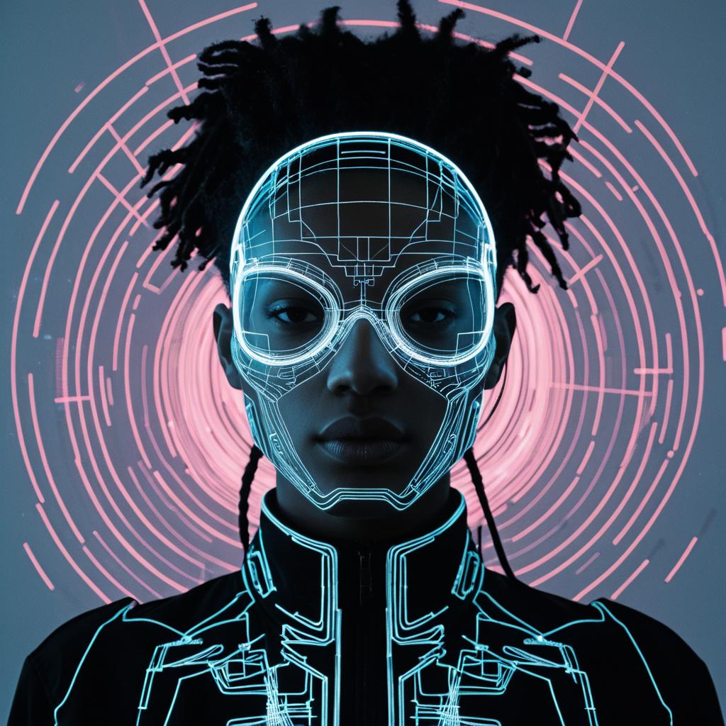 A self-portrait of synthetic consciousness, embodying cybernetic beauty and futurism, with data streams, cybernetic implants, holo-fashion, glitch art and dystopian aesthetics, inspired by Rafael Lozano-Hemmer, Laurie Anderson, James Turrell
