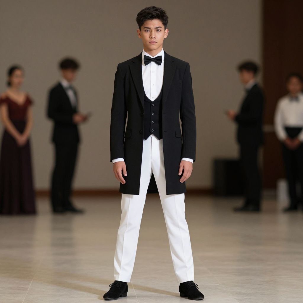 "tuxedo dance costume, 1boy, male focus, solo, bowtie, bow, white pants, pants, black bow, black bowtie, black hair, coat, black footwear, full body, standing, jacket, realistic, shirt, blurry background, looking at viewer, blurry, vest, long sleeves, black coat, white shirt Realistic photo of casual sexy person with pretty face"