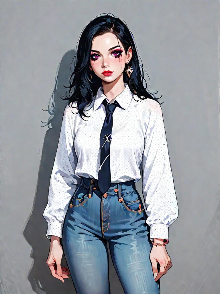 Digital artwork of a young woman with black hair and vibrant makeup featuring purple eyeshadow and red lipstick. She is wearing a semi-sheer white blouse with subtle polka dots, a black tie, and high-waisted light-wash skinny jeans. The woman accessorizes with minimal jewelry including a thin bangle and geometric earrings. The background is plain gray, highlighting the subject’s relaxed yet fashionable look.
