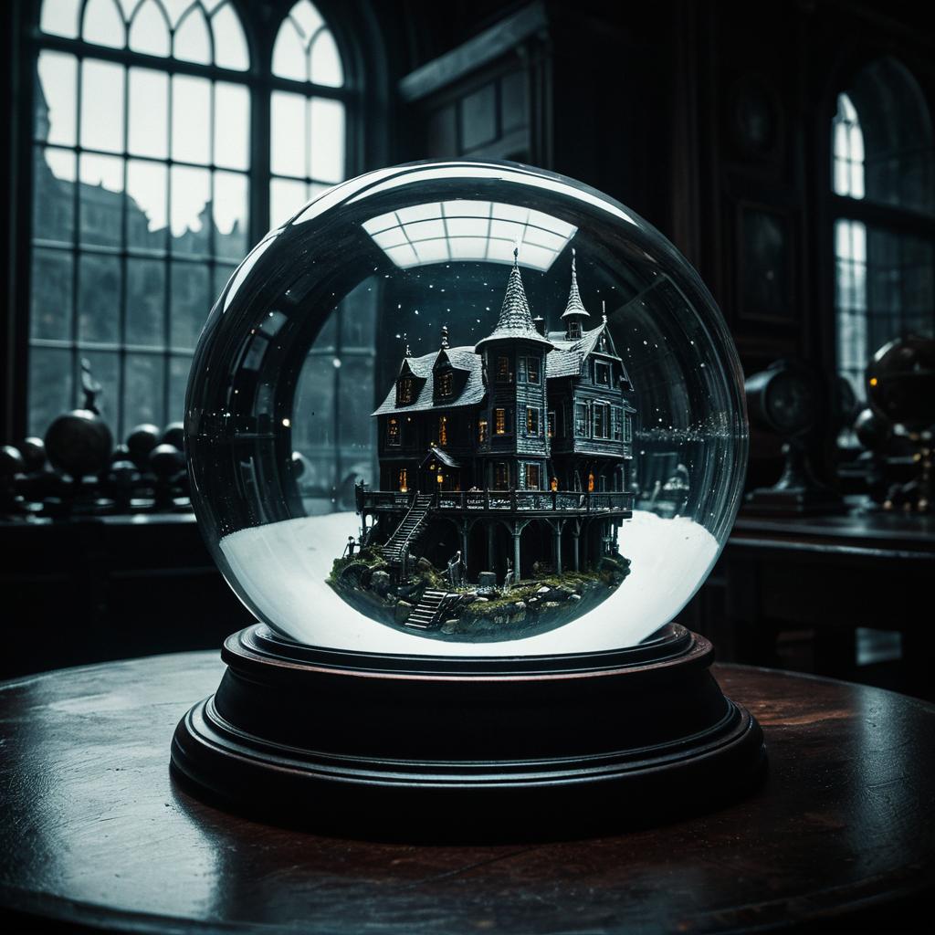 A highly detailed miniature Victorian-style house with lit windows, enclosed inside a clear glass snow globe. Set on a wooden base, the scene is captured in a dimly lit room with large arched windows and antique furniture in the background, creating a moody, atmospheric environment with realistic reflections and shadows.