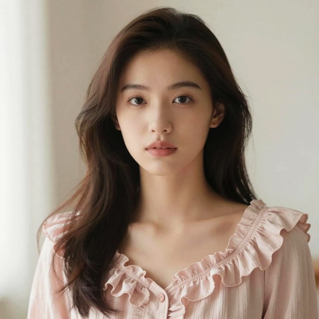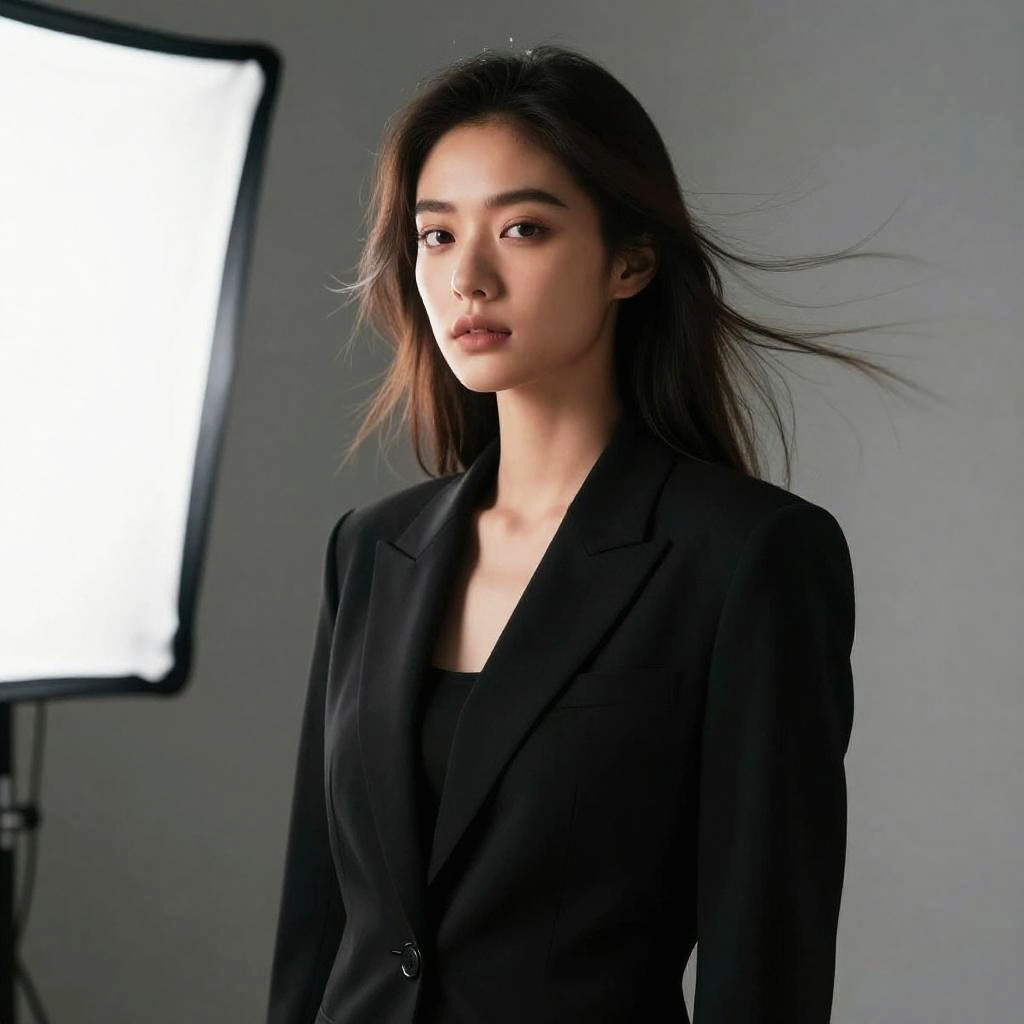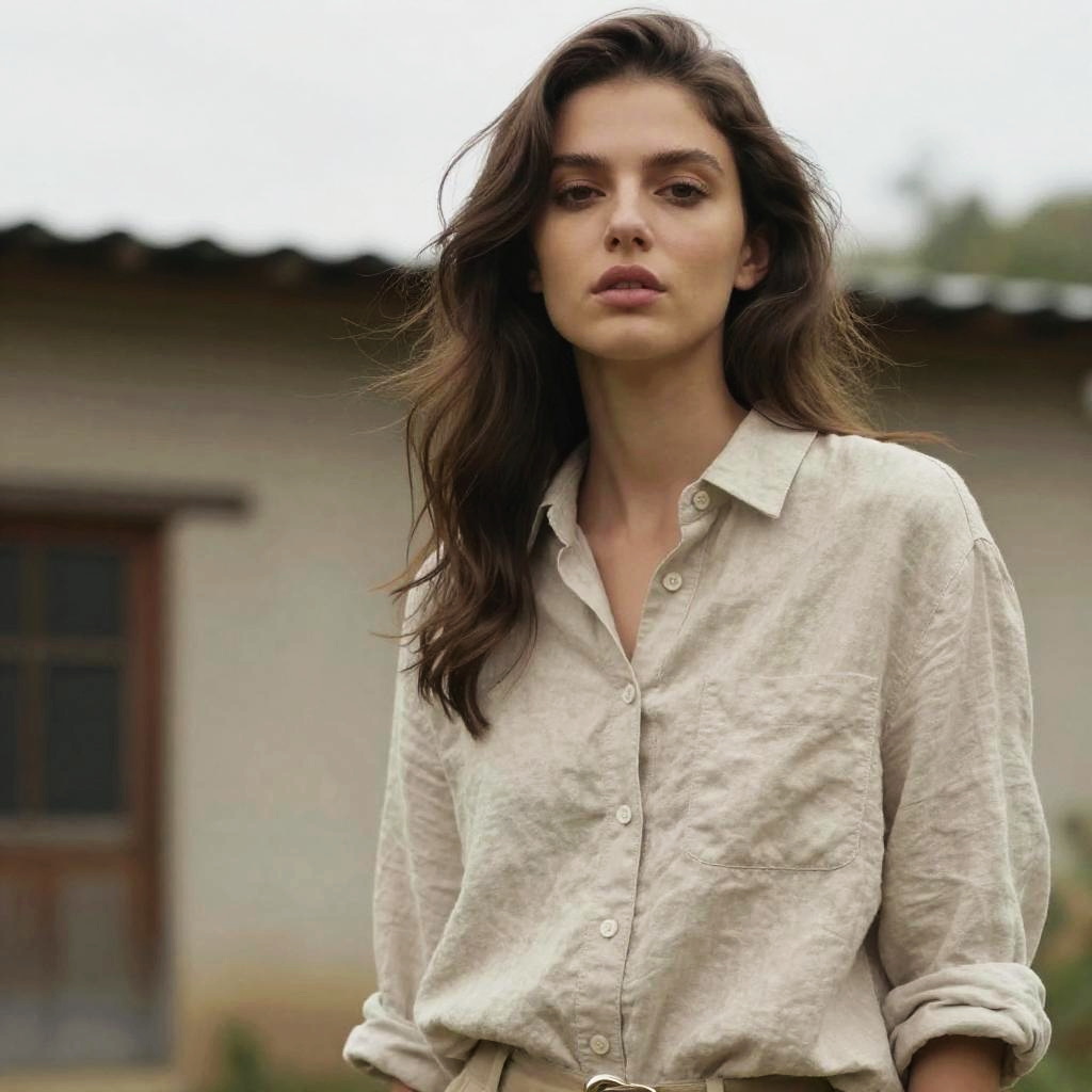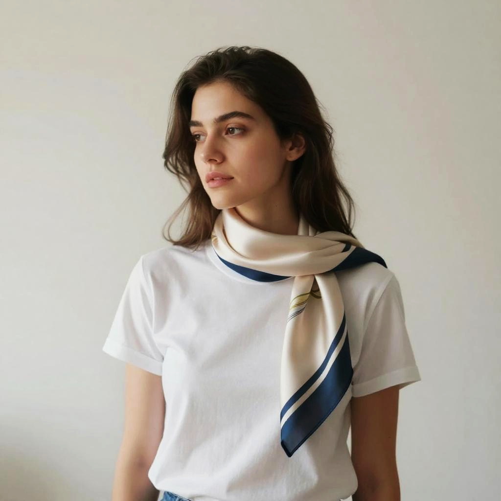 Photo portrait of a young woman elegant silk scarf and plain white tee, diffused skylight, minimalist soft gradient background lighting, hyper realistic photography, motion blur 80 mm sigma art