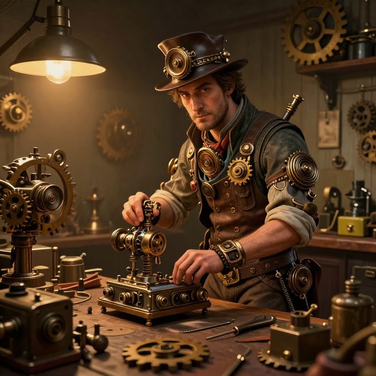 Jahren depicted as a steampunk inventor in a cluttered workshop filled with gears and mechanical devices, warm amber lighting, intricate details on gadgets and tools, vintage color palette, highly detailed character design