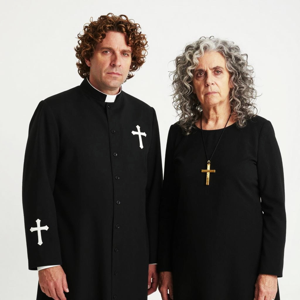 Photograph of a black, long-sleeved, buttoned-up clergy robe with white cross embroidery on the chest and sleeves. Next to it, a person with curly, wild gray hair and pale skin wearing a black top, looking serious. A gold cross pendant hangs around their neck. The background is plain white, making the black robe and hair stand out prominently.