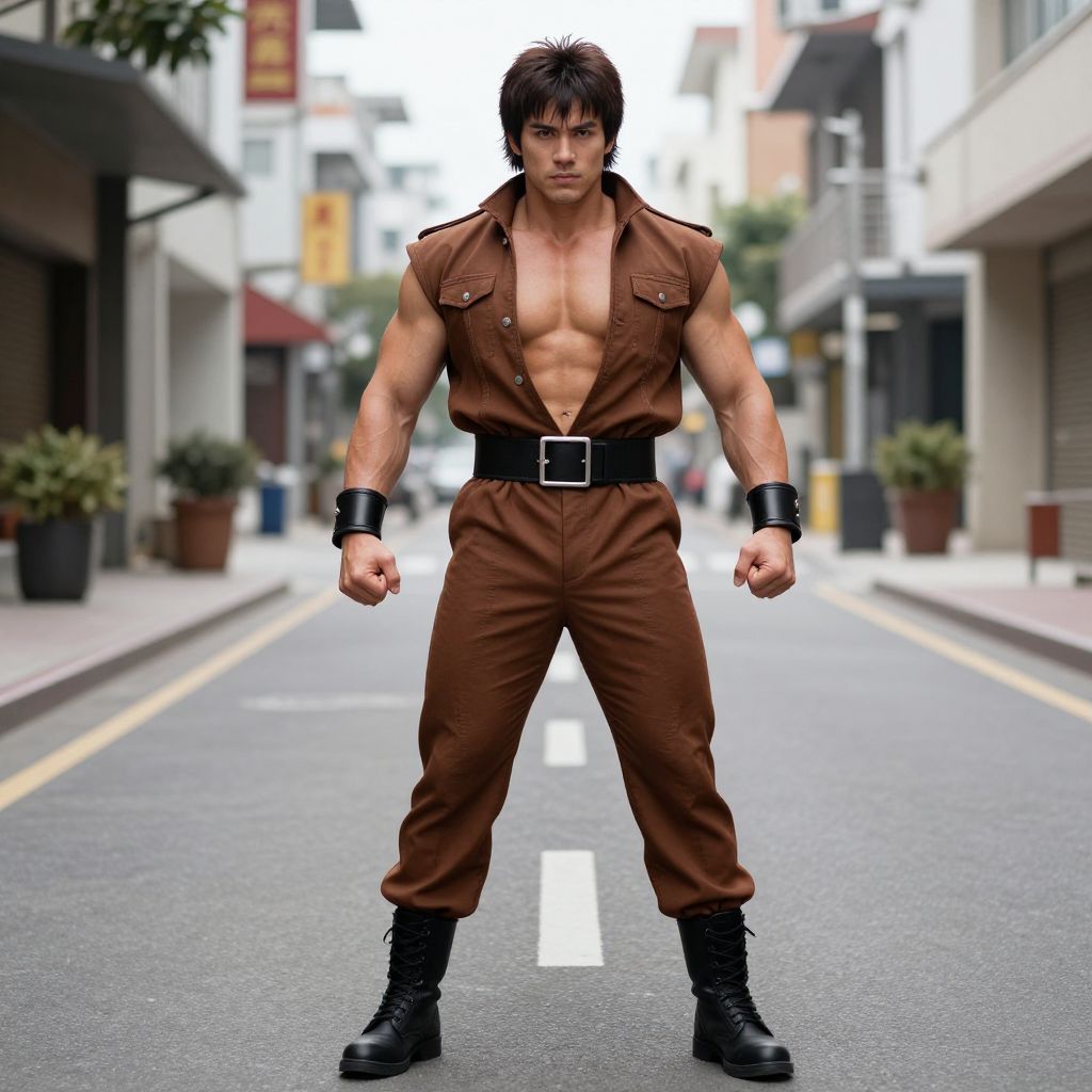 Muscular man wearing a brown sleeveless Street Fighter-inspired costume with a wide black belt and black boots stands confidently on an urban street. The outfit is open at the chest, revealing the man's well-defined abs. The background shows a narrow street with plants in pots and buildings on both sides.