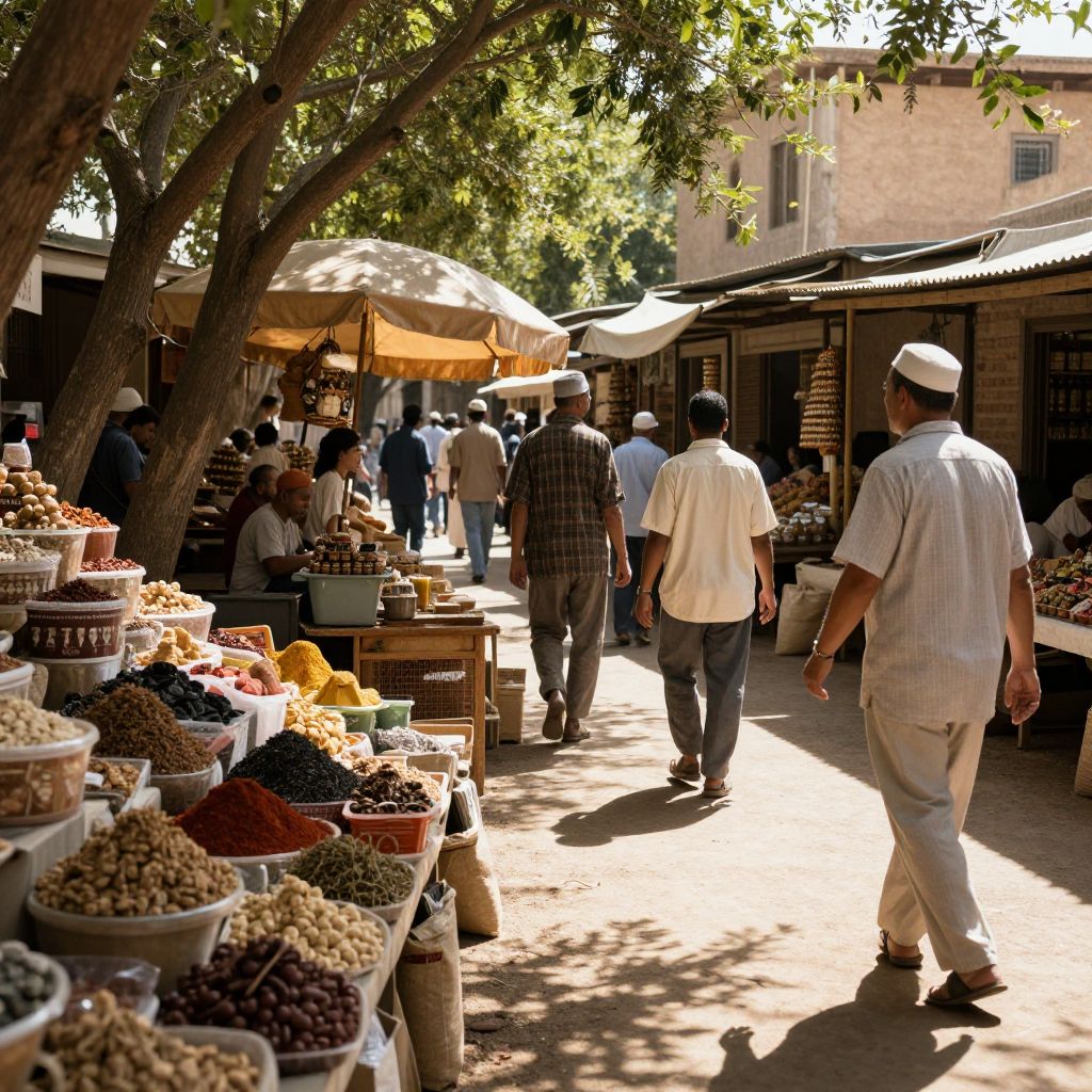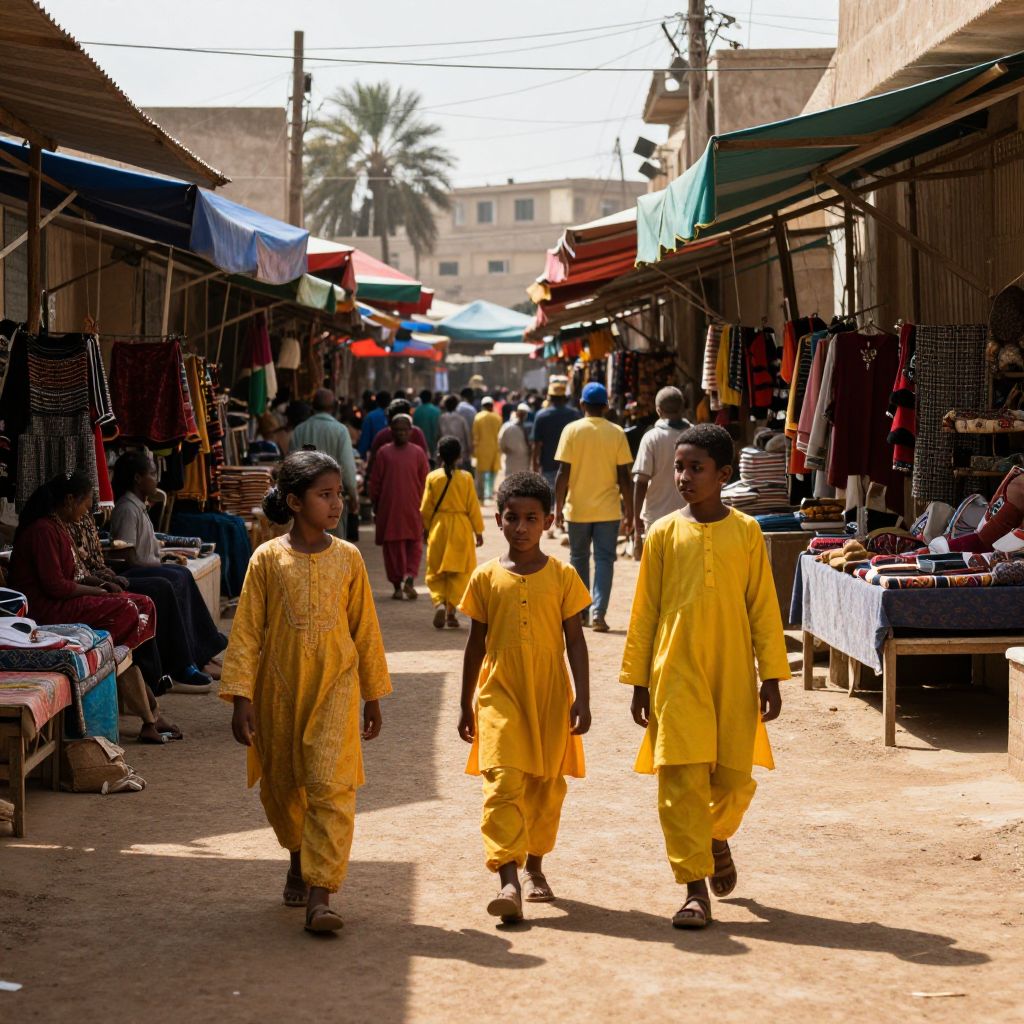 Children stroll through a bustling marketplace, their vibrant yellow outfits contrasting against the earthy tones of the narrow street lined with colorful awnings and vendors' stalls, as shadows stretch long beneath the warm sunlight.