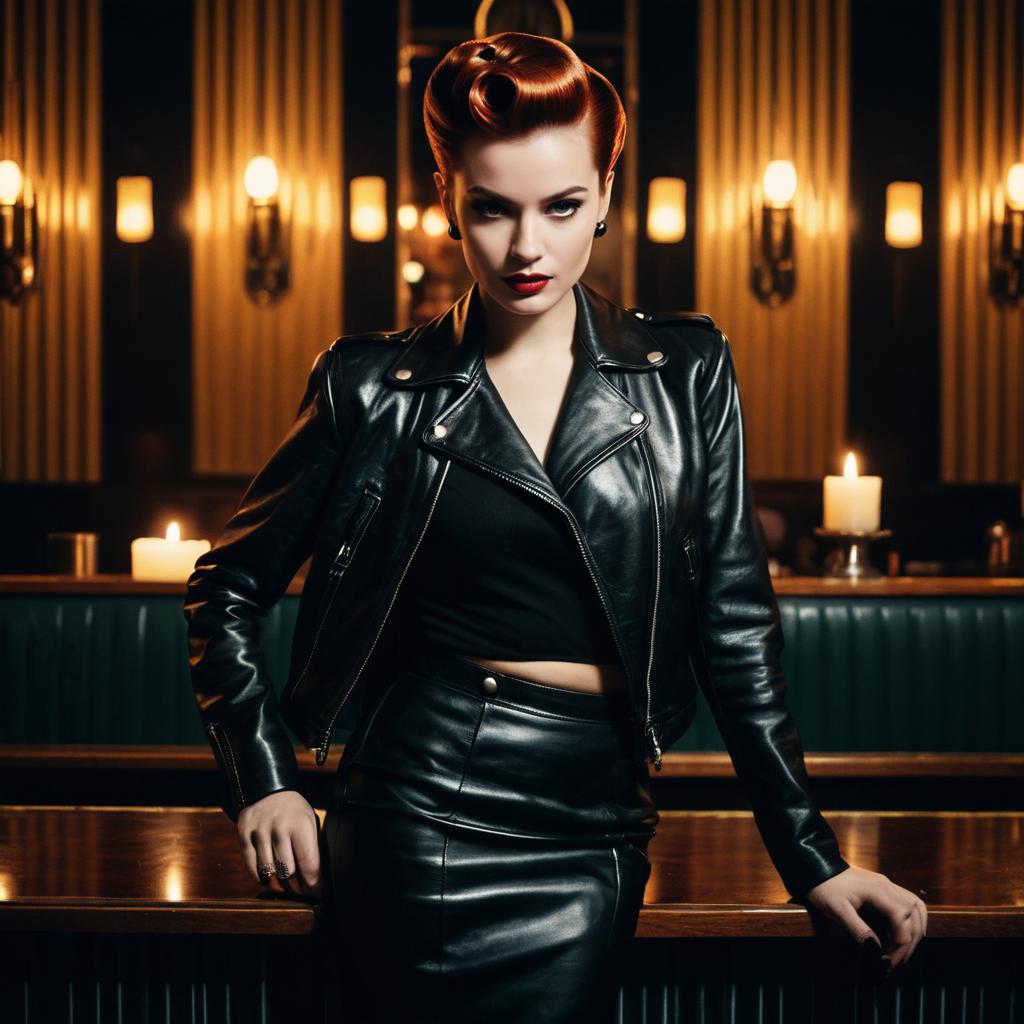 Victory Rolls hairstyle on woman, wearing pin-up dress, in vintage train station, captured in fashion editorial style with soft color tone.