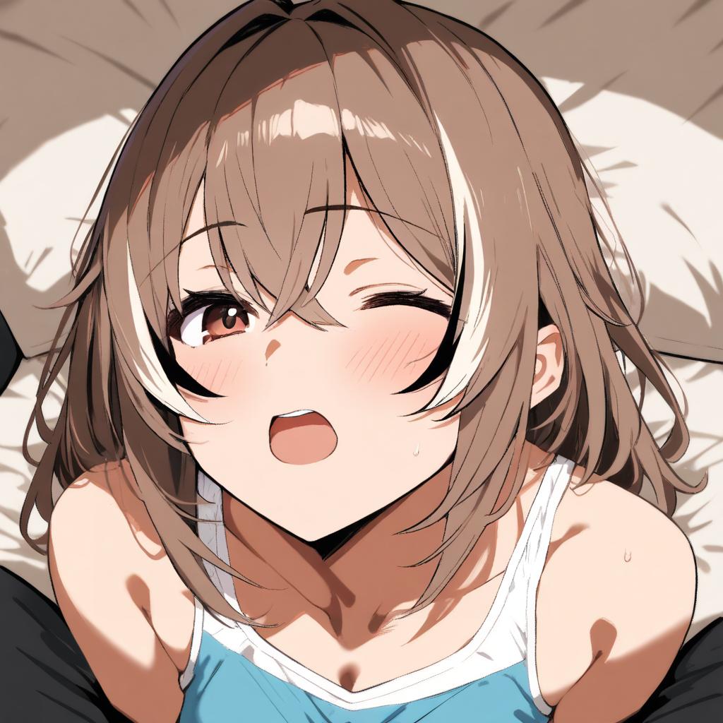 Swf, SFW, nanashi_mumei, 1girl, blush, one eye closed, open mouth, brown hair, solo focus