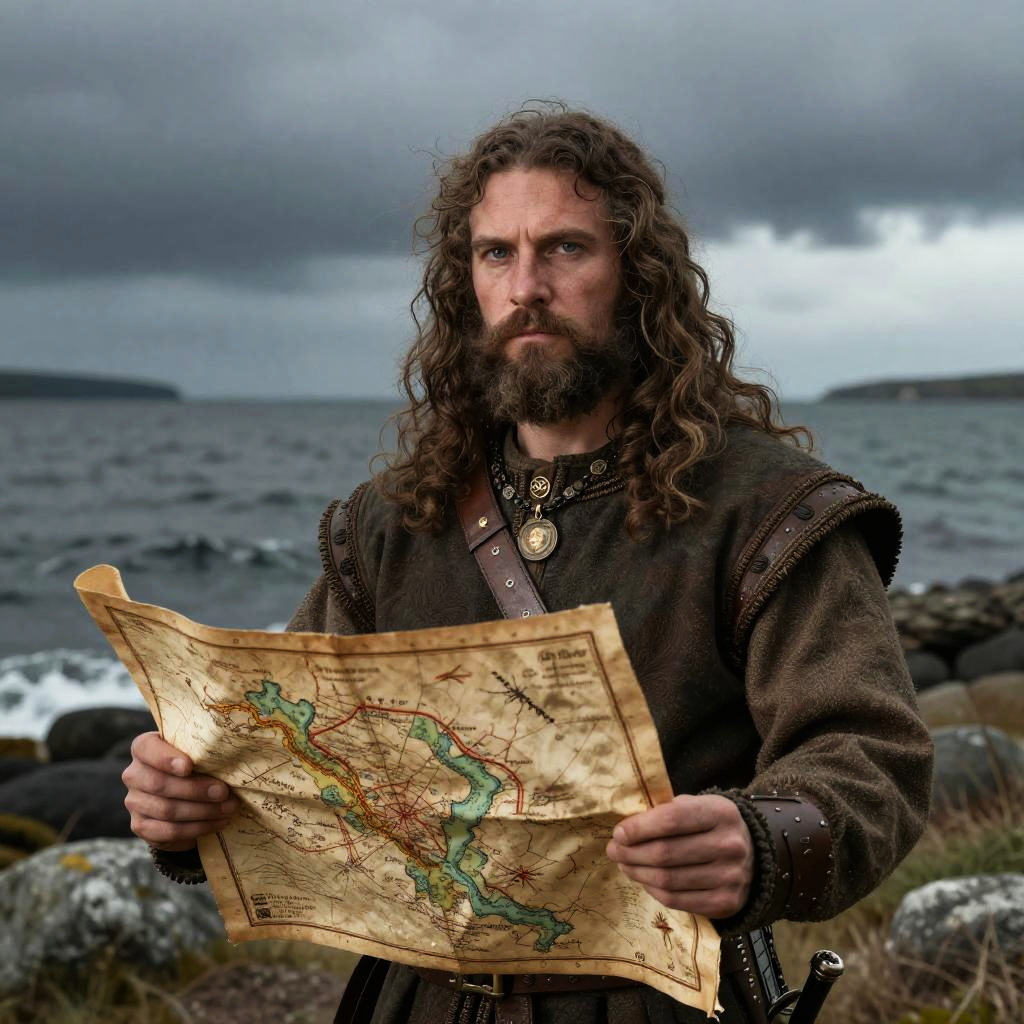 Portrait leif erikson, ancient Scandinavian explorer with long beard and leather armor, standing on ship deck with sails, sunset lighting, hyper-realistic style, atmospheric Viking Age setting