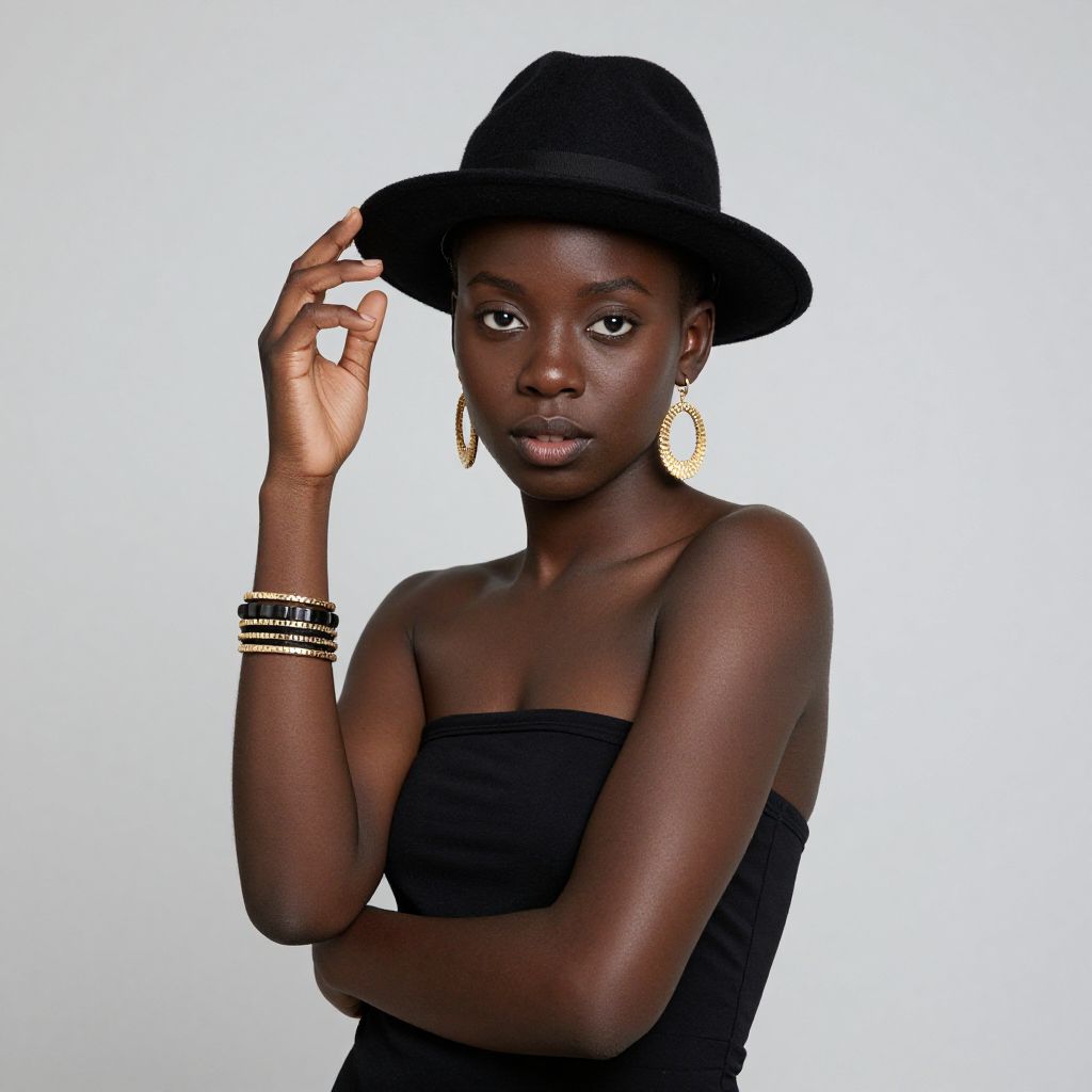 Photograph of a young Black woman with dark skin, wearing a black wide-brimmed hat, strapless black top, and multiple black bangles on her right wrist. She has large, gold, circular earrings and is holding the brim of her hat with her right hand. Her expression is neutral, and she is looking directly at the camera. The background is a plain, bright white, making her the focal point. The lighting highlights her smooth skin and the texture of her top and accessories.