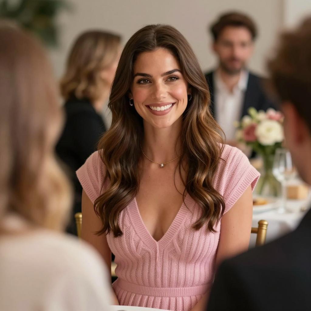 Photograph of two young women seated at a restaurant table, both smiling and holding white lace parasols. The blonde woman on the left wears a pink dress with a floral brooch, while the dark-haired woman on the right wears a pink satin dress. There are blurred men in suits in the background, giving the image a formal or elegant atmosphere.