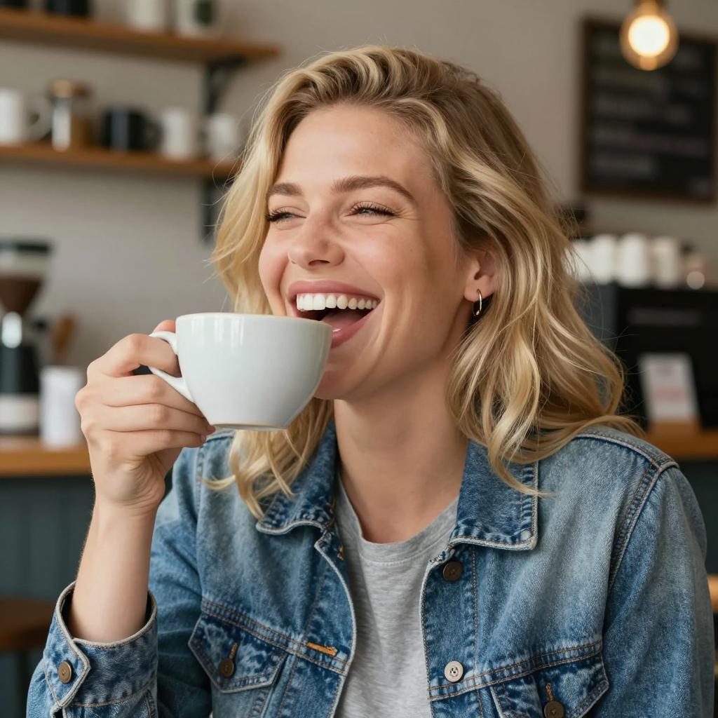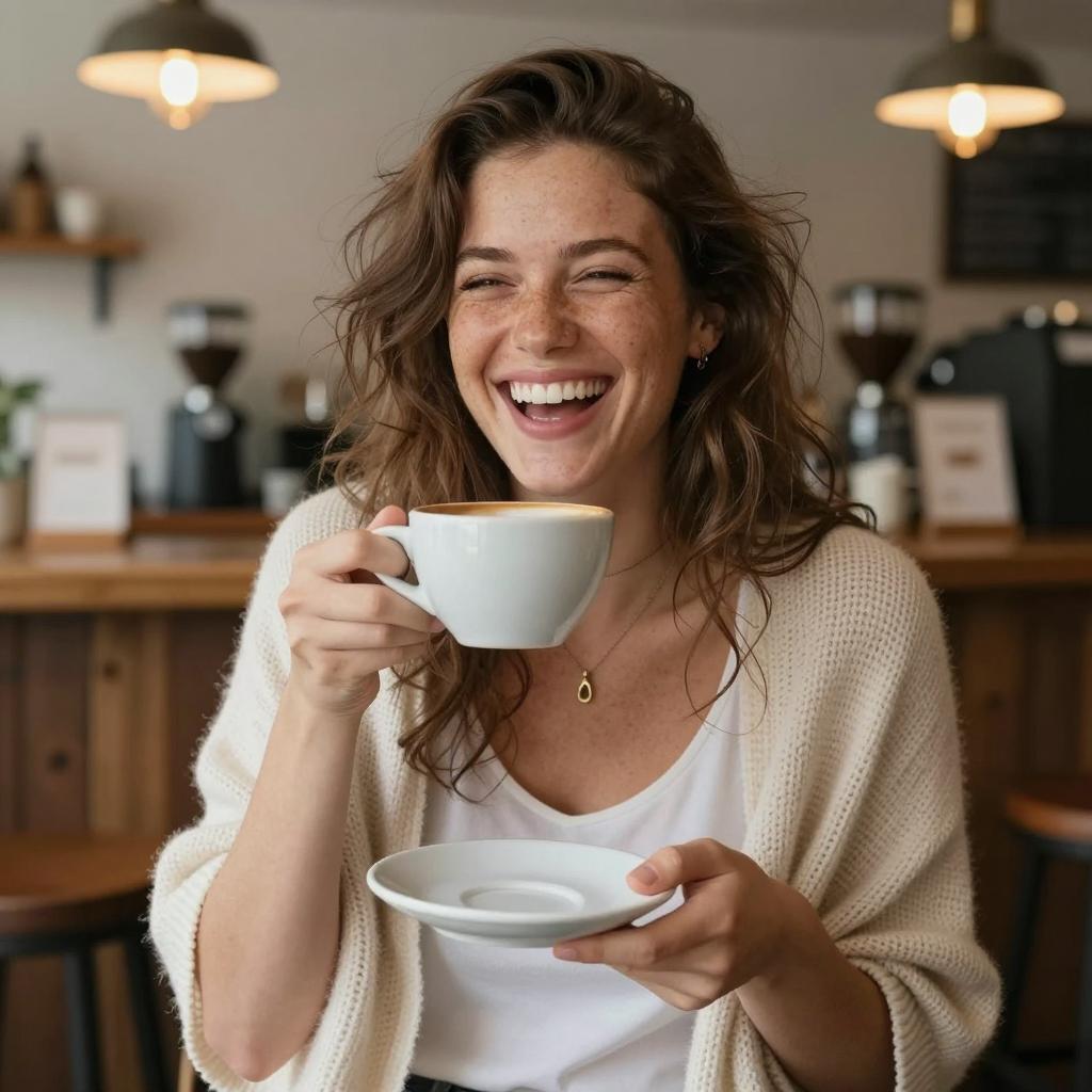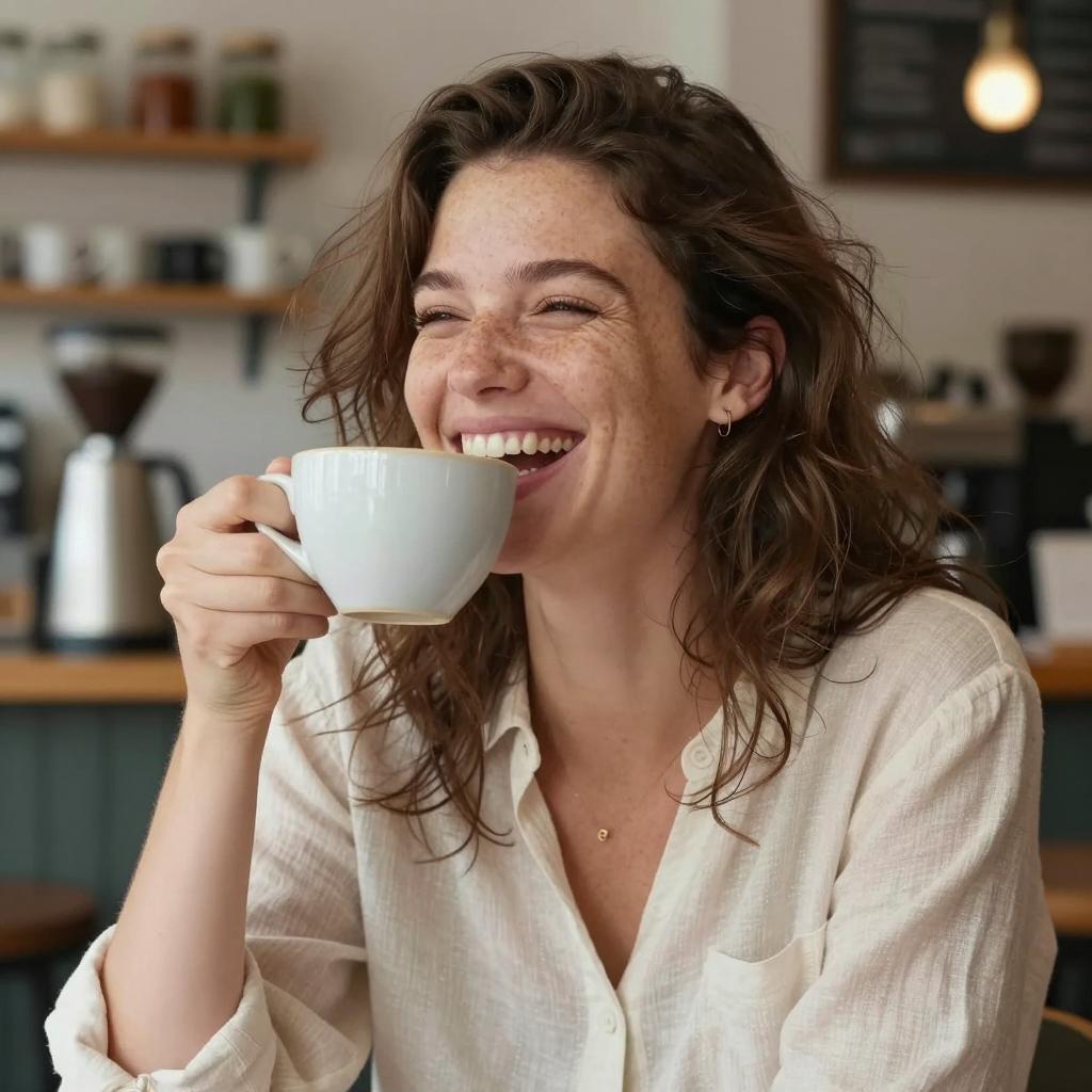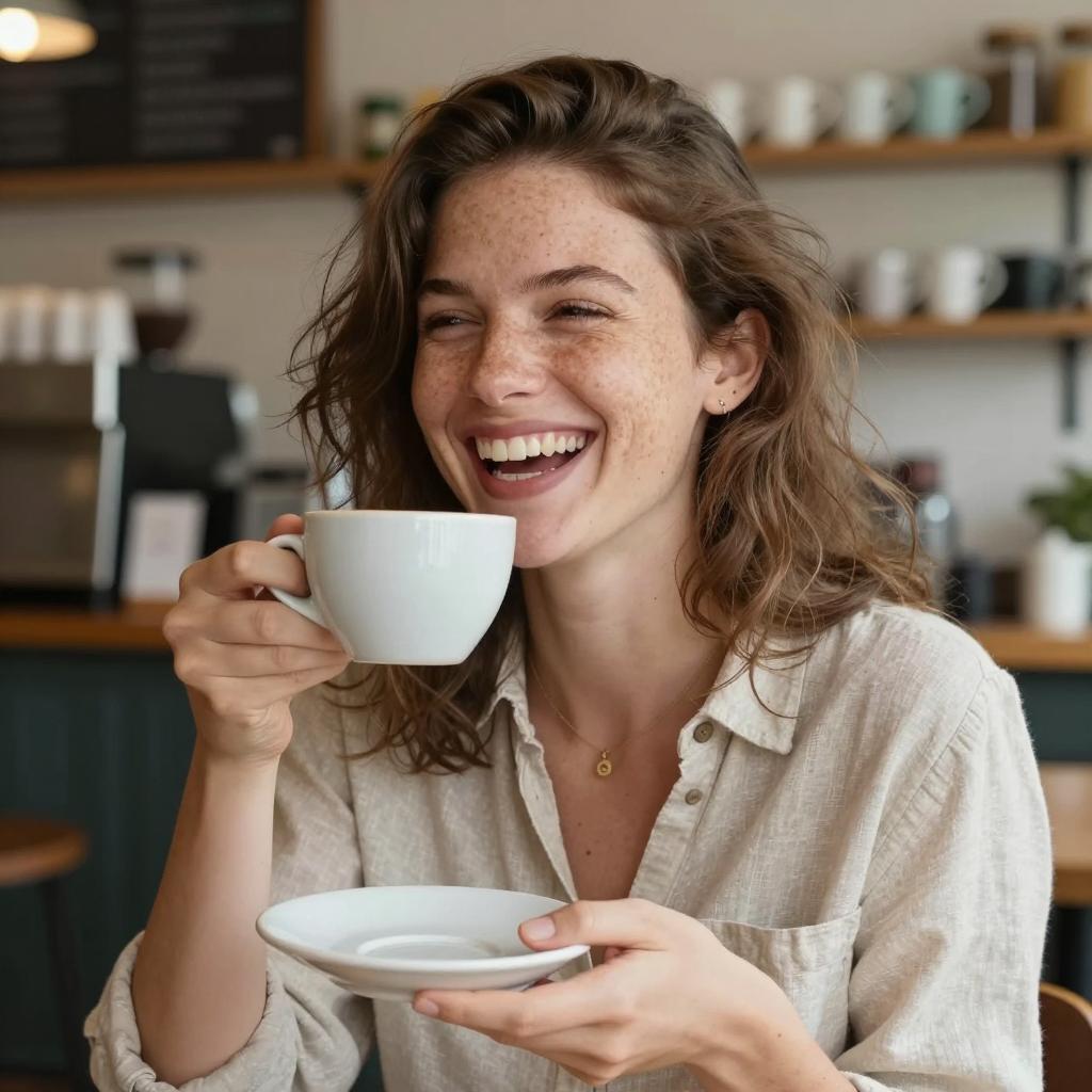 Close-up portrait of a freckled woman with messy light brown hair, wearing a simple beige linen blouse. She is holding a white coffee cup and saucer while laughing joyfully in a cozy café setting. The background shows blurred shelves with mugs and jars, creating a warm and friendly atmosphere.