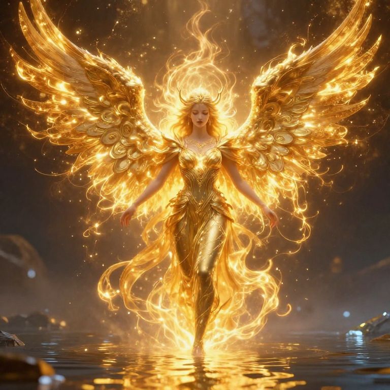 Digital art depicting a fiery, angelic woman with large, glowing golden wings. She stands on a reflective surface, surrounded by swirling flames that illuminate her face and body. Her attire is a shimmering, metallic gold dress that matches the wings, and her hair is also engulfed in flames. The background is a dark, starry sky with faint celestial bodies. The image has a fantasy, ethereal quality, emphasizing her divine and powerful presence. The flames create a dynamic, radiant effect, highlighting her as the central figure.