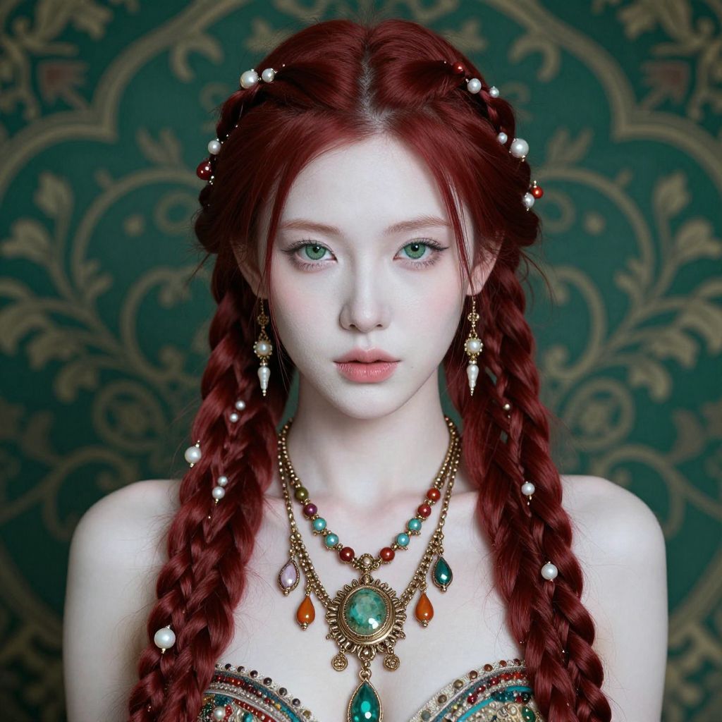 A stunning, hyper-realistic woman with long, pale skin, green eyes, and intricate red braids adorned with colorful pearls, wearing an elaborate necklace, set against a detailed, green, patterned background.
