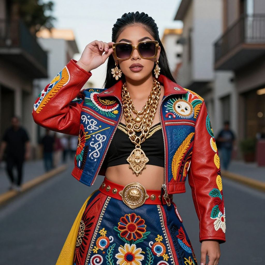 Buchona costume, intricate Mexican narcoculture-inspired attire, vibrant embroidered leather jacket and skirt, bold accessories like large gold chains and oversized sunglasses, dramatic makeup with smoky eyes, urban street background, cinematic lighting