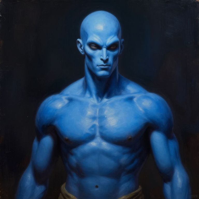 Alien Lord Vishnu, blue skin, athletic, attractive, kind face, ultra realistic, unreal engine, cinematic lighting, oil painting, thick pallet knife strokes, Boris Valejo style,