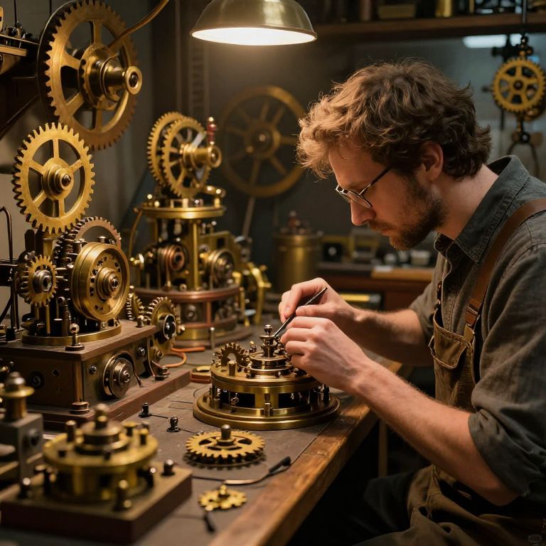A steampunk workshop filled with capulates mechanical devices in various stages of assembly, brass gears and cogs, warm amber lighting, intricate craftsmanship on display, a genius inventor working intently amidst the detailed background
