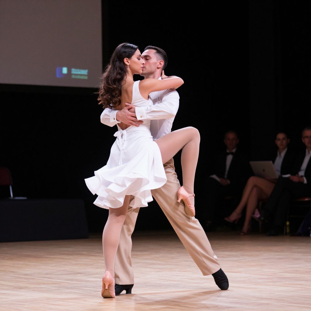Photograph of a ballroom dance performance. A woman with long dark hair in a white, ruffled dress and beige tights is lifted by a man in a white shirt and beige pants. The woman's feet are in pink dance shoes, and the man's face is partially obscured. Background includes a dark stage with a projector screen and seated audience. Lighting is bright on the dancers, creating a spotlight effect.