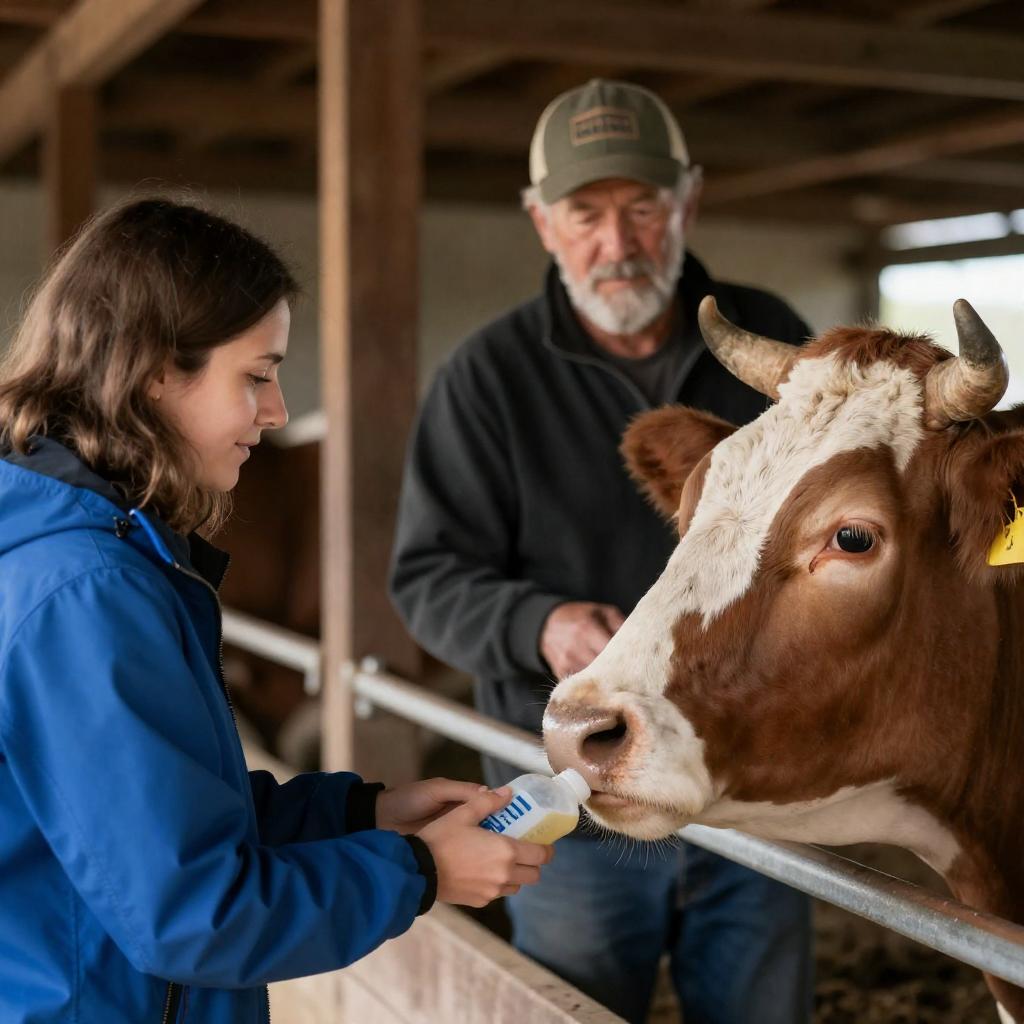 Photograph of a woman with shoulder-length brown hair, wearing a blue jacket, feeding a brown cow a bottle. An older bearded man in a green cap and black shirt stands behind the cow, holding its head. Wooden barn background. Cow's head in the right foreground, woman on the left, man in the background.