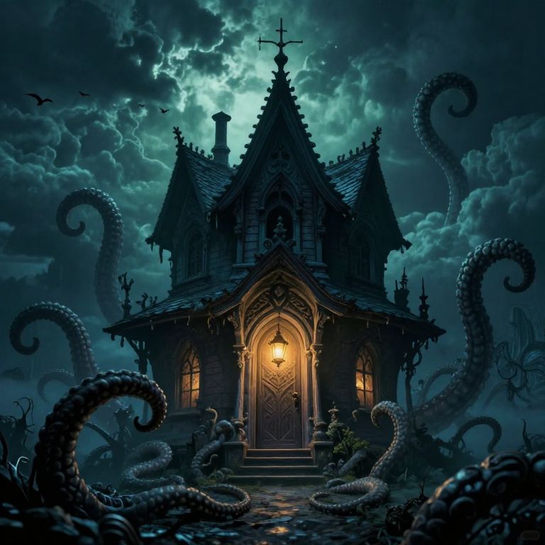 Gothic, eerie house with glowing lantern, surrounded by dark, tentacled creatures under a stormy, moonlit sky. Digital art.