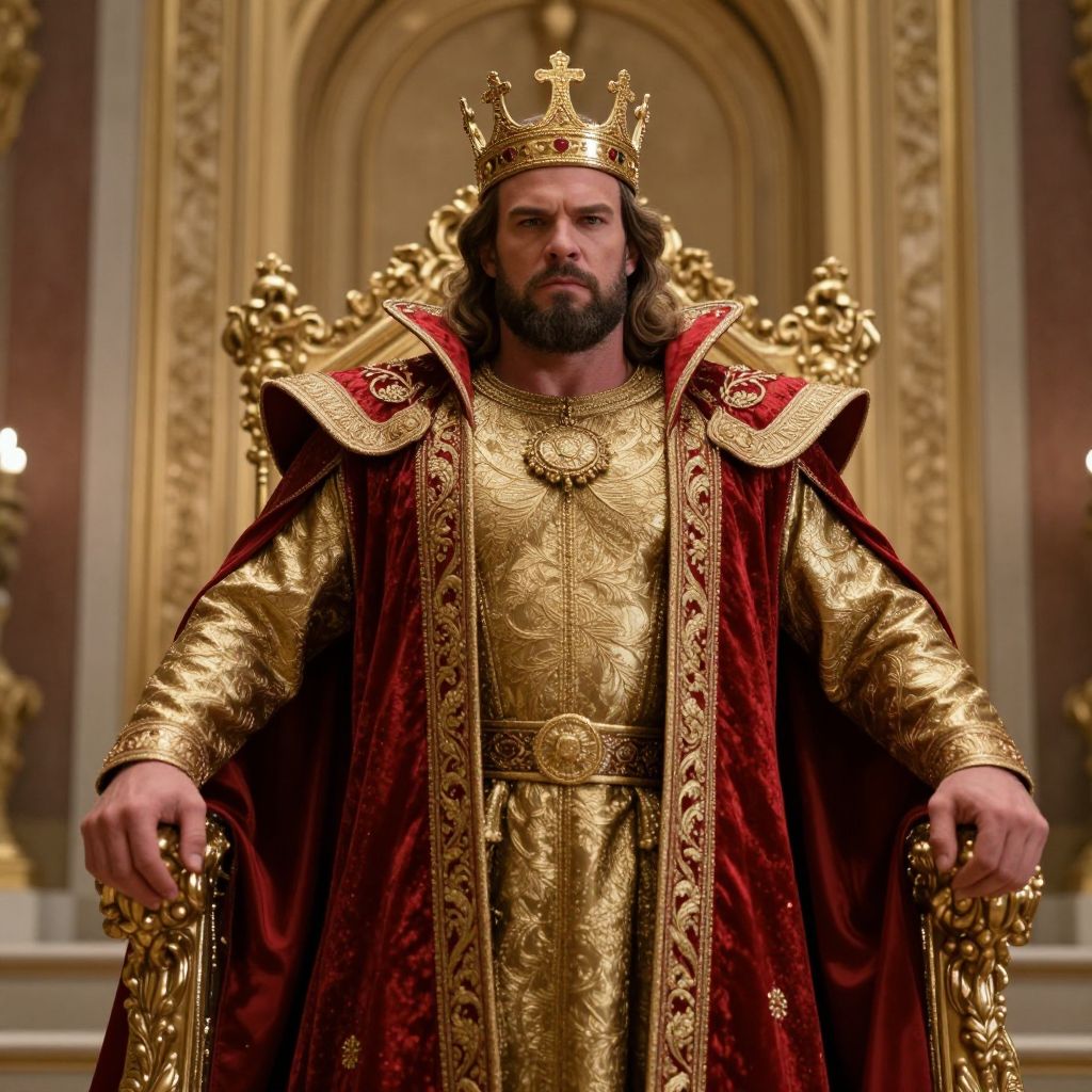 A regal, muscular man with a commanding presence, wearing a magnificent crown on his head, dressed in an elaborate costume featuring rich red and luxurious gold accents, standing powerfully in a grand throne room.