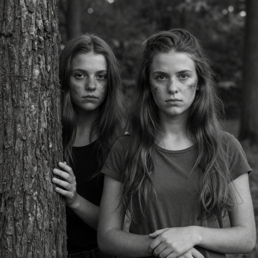 Black-and-white photograph of two young women with long, messy hair, standing behind a tree. Both have dirt on their faces. The woman in the foreground looks directly at the camera with a serious expression, hands clasped. The second woman peeks from behind the tree, looking slightly to the left. Forest background.