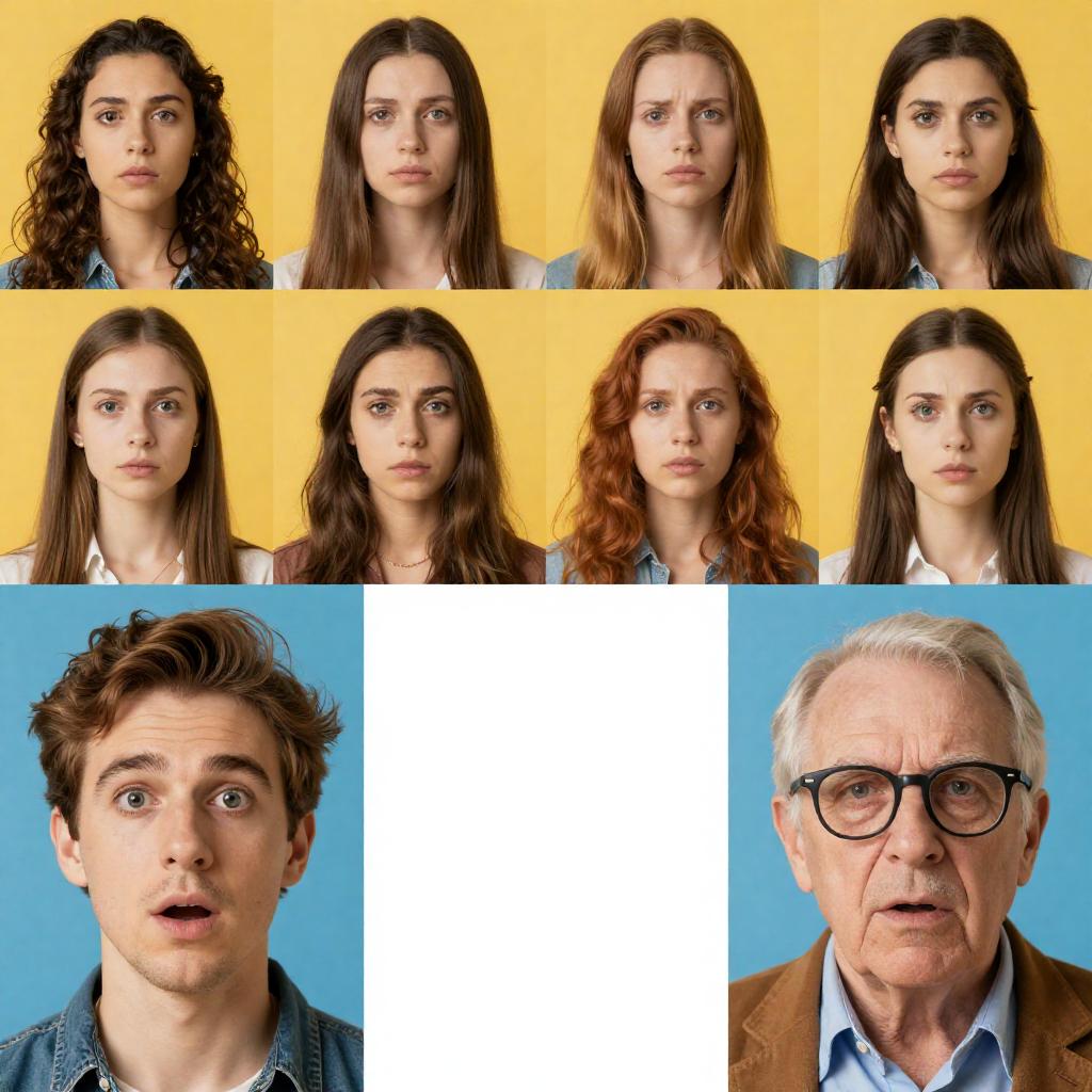 Photograph of seven people, six women and one man, in a grid layout against yellow and blue backgrounds. Top row: six women with varied hairstyles, expressions neutral to slightly serious. Bottom left: man with brown hair, open mouth, surprised expression. Bottom right: elderly man with glasses, partially open mouth, serious expression. Bottom center: white space. Women wear casual to semi-formal clothing. Man wears a brown jacket, blue shirt. Bright colors, varied facial expressions.