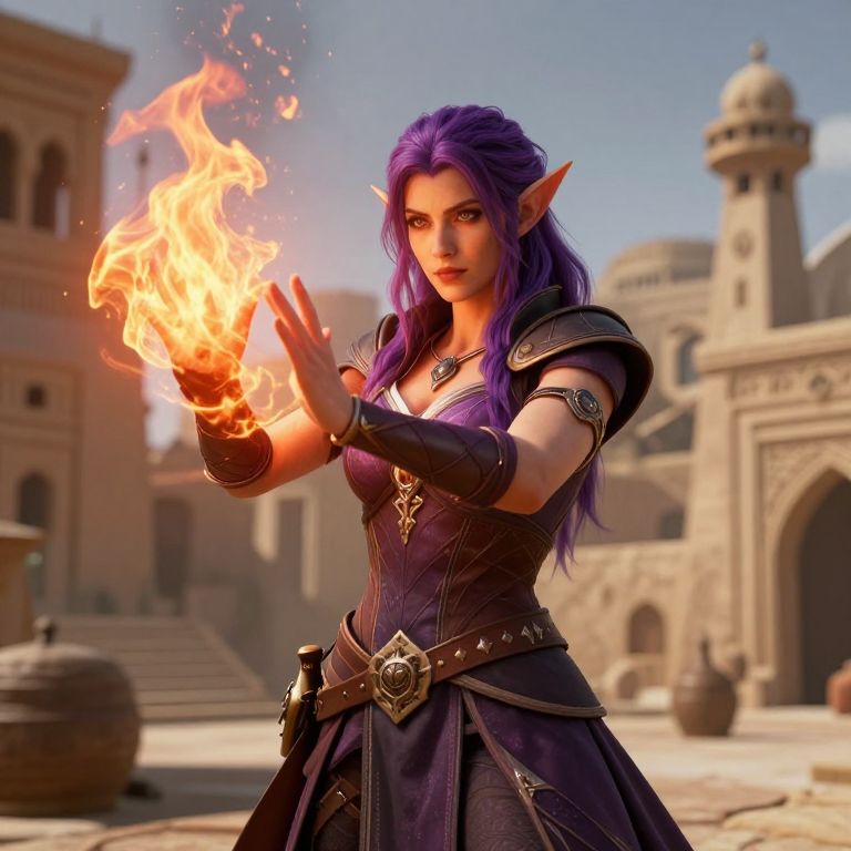CGI fantasy image of a purple-haired, elven woman casting a fiery spell in a sunlit, ancient stone courtyard. She wears dark, orn