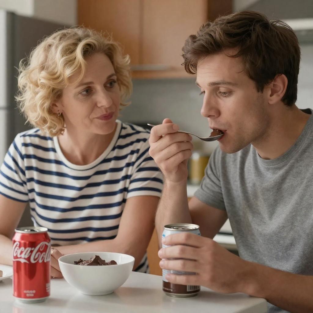 Photograph of a kitchen scene with a middle-aged woman with short, curly blonde hair and a striped shirt, and a younger man with short brown hair and a gray shirt. The man holds a spoon to his mouth, eating from a can, while the woman looks at him. A white bowl with chocolate and a can of Coca-Cola are on the table.