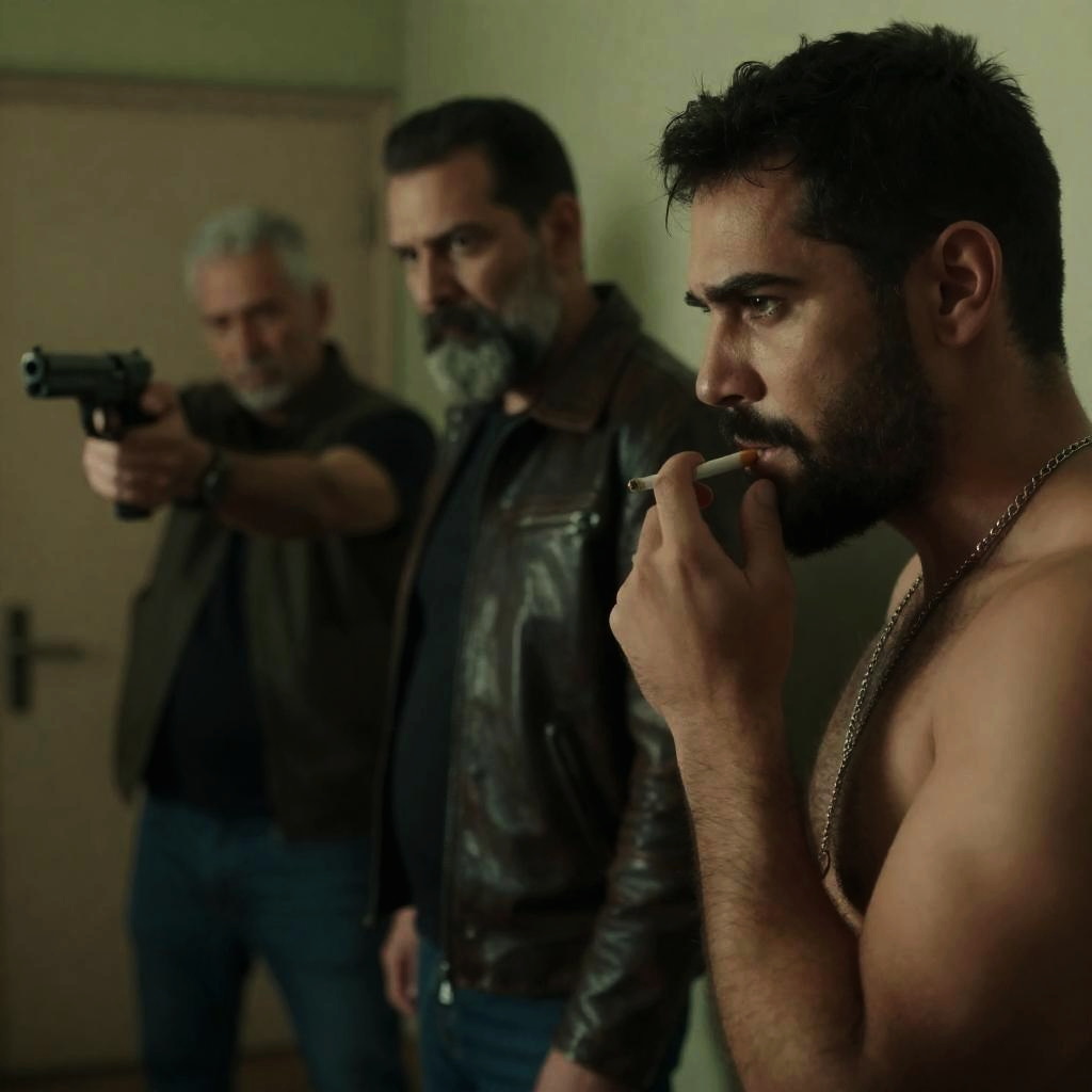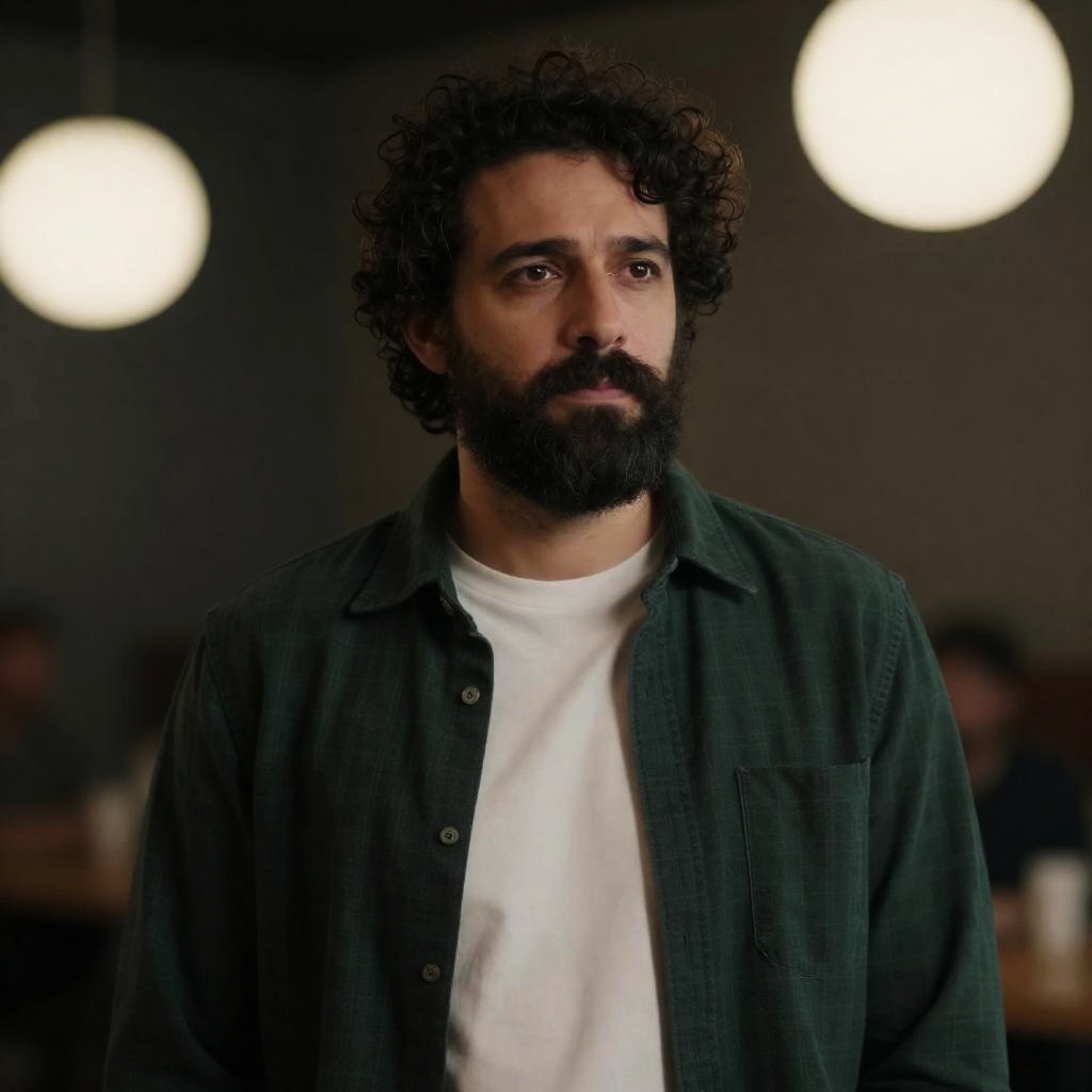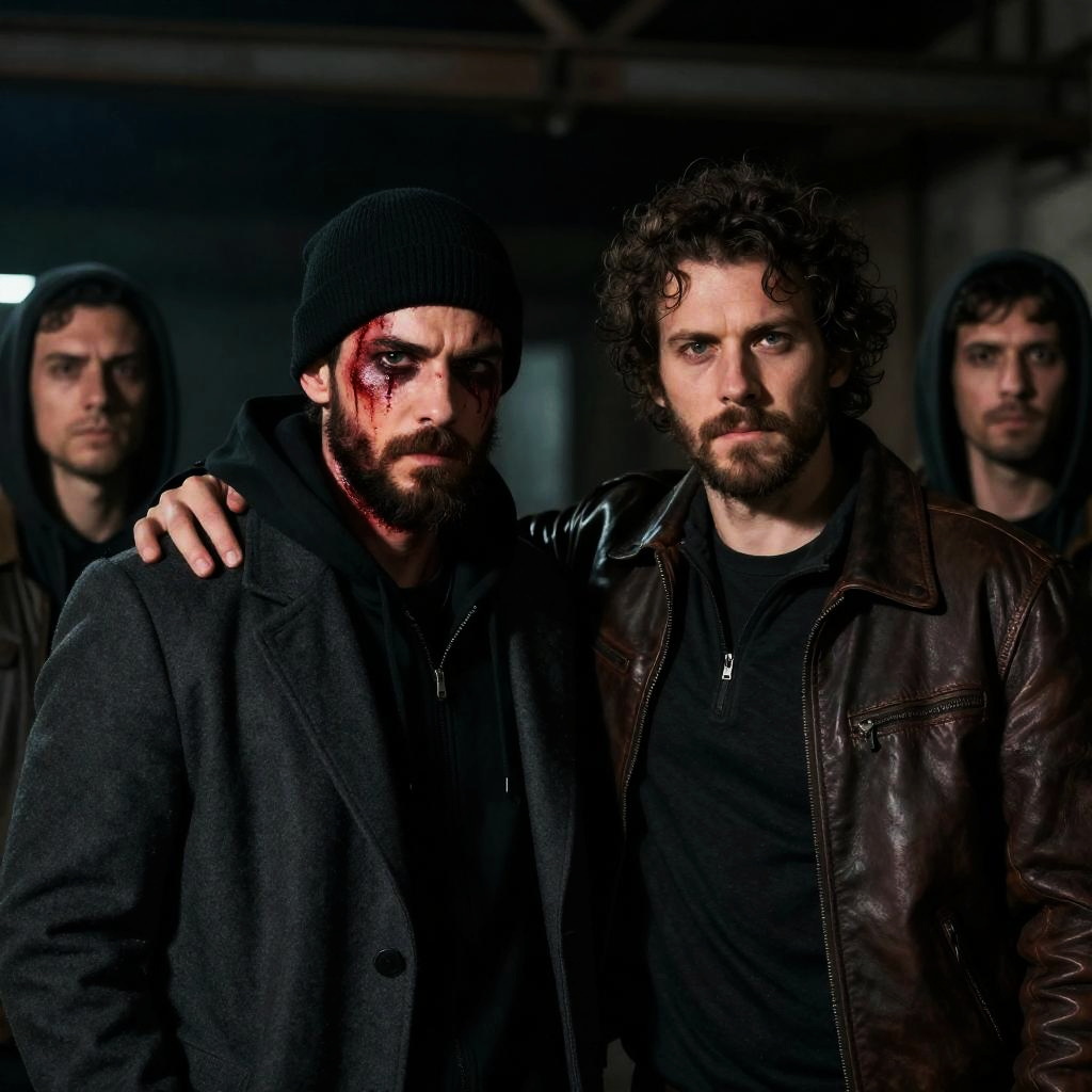 Close-up photograph of a bearded man with intense gaze, dark hair, and a scar on his right cheek. He wears a hooded jacket with a ured fabric. Background is blurred. Man's expression is serious and focused.