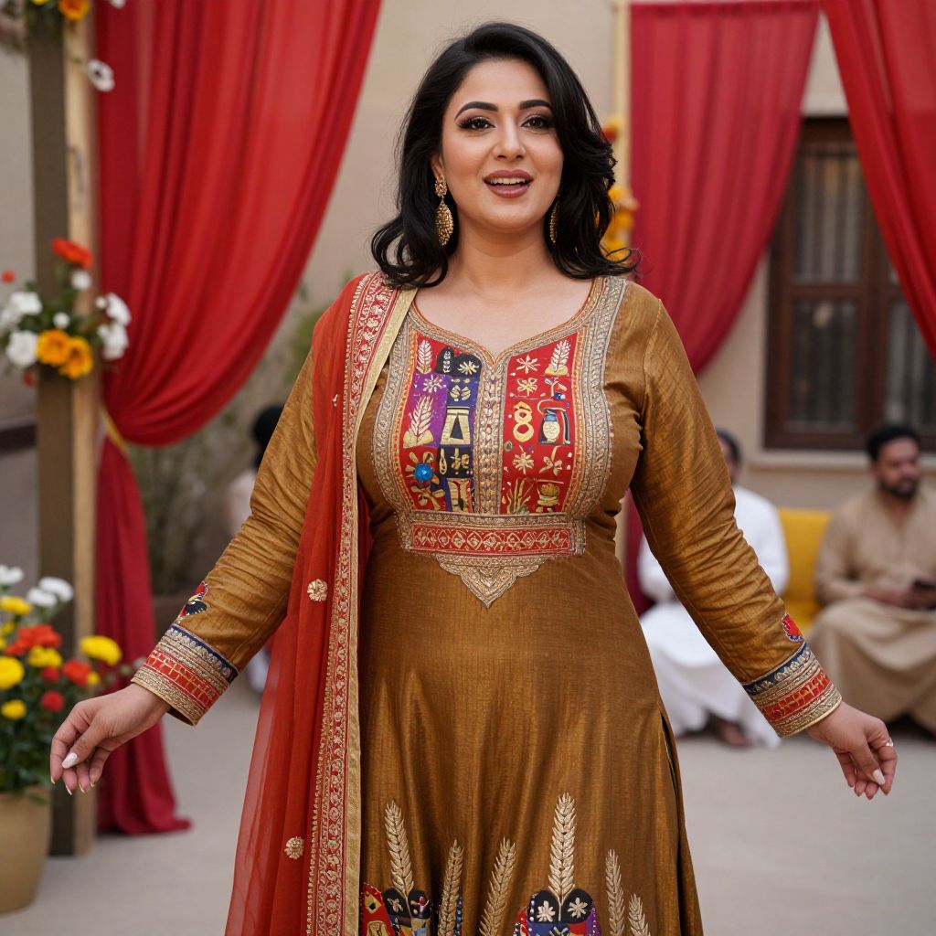 A dynamic lifestyle shot of a woman with medium-length black hair, a strong jawline, and a cheerful expression, dressed in a richly textured Punjabi salwar with a central band of red and gold zari detailing and hand-painted traditional motifs like wheat and kheer patterns, standing in a traditional Punjabi wedding setup with flowers and red curtains in a courtyard during a festive gathering.. The woman has big tits and cute face