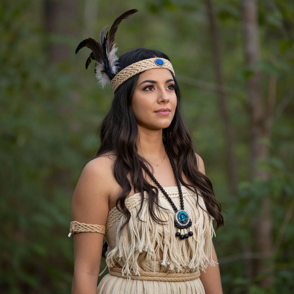Pocahontas Cosplay, woman in native dress with feather and feather headband in forest