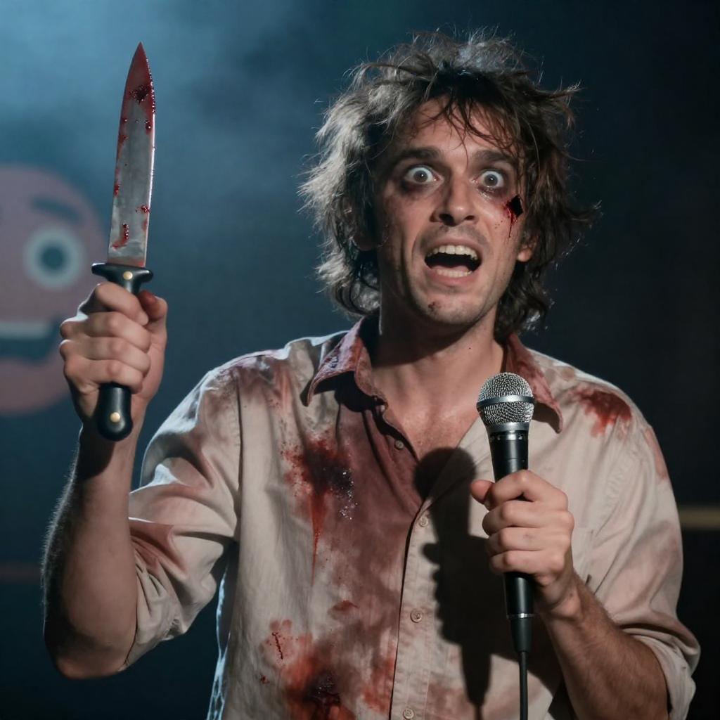 A digitally altered photograph of a disheveled man with wild hair and blood-stained shirt, holding a bloodied knife in his right hand and a microphone in his left. He has a crazed expression with wide eyes and an open mouth. The background is a smoky blue light, with a cartoonish face partially visible on the left.