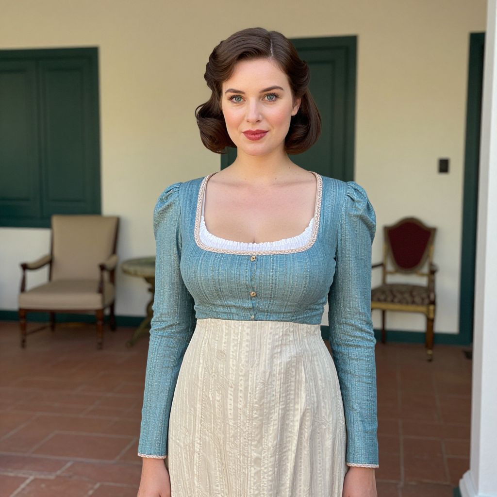 A woman in her early 30s with bright blue eyes and a side-swept bob wearing a formal dress with long, fitted sleeves and a vintage-inspired costume design in a historical reenactment setting, outdoors in a colonial-style courtyard with painted walls and antique furniture.. The woman has big tits and cute face