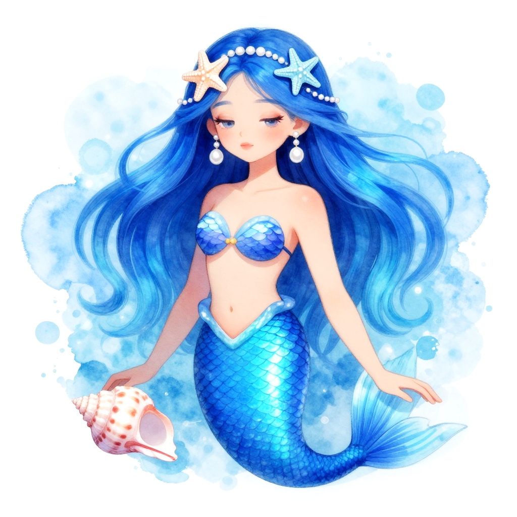 A beautifully detailed digital illustration of a mermaid with long flowing blue hair adorned with a starfish and pearl earrings. She is depicted with shimmering blue scales and seashell accessories, set against a watercolor splash background that evokes an underwater fantasy theme.