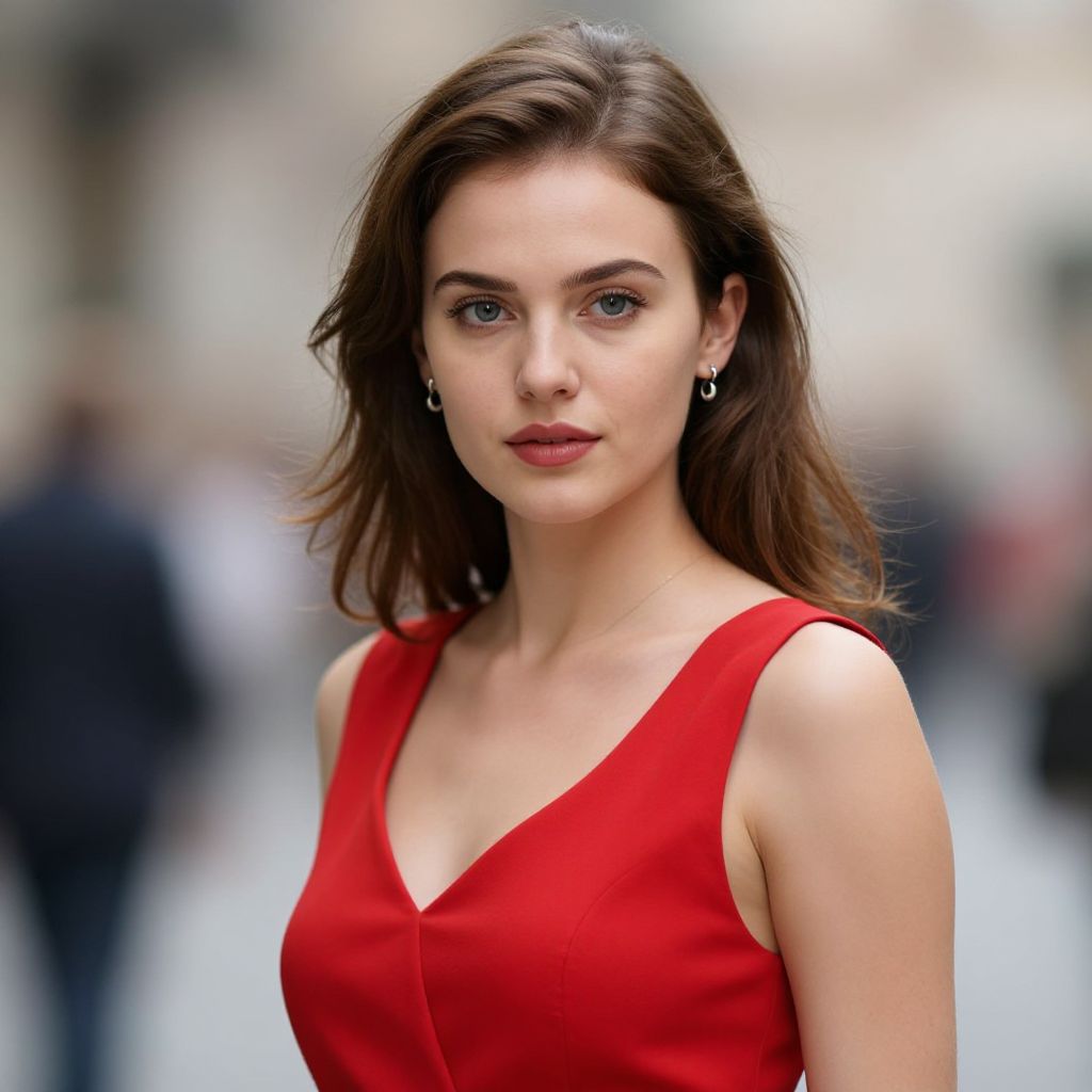 "fifties fashion woman, 1girl, earrings, jewelry, shirt, realistic, looking at viewer, outdoors, blurry background, white shirt, blurry, day, brown hair Realistic photo of casual sexy person with pretty face"
