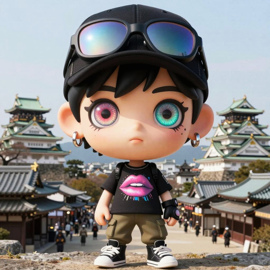 1girls, nsfw, photorealistic, ultra high res, intricate, hyperdetailed, (skindentation), cute, feminine, [symmetrical:0.8], detailed body, (detailed face:1.1), (outlined iris), (hidrocor lenses), (perfect eyes), 4k, beautiful, (masterpiece:1.2), (best quality:1.2), (curved roof), (medieval Japanese city centered around a Japanese castle in the background) (Japanese Temples, Japanese shrines), (guards on the streets below)(Cyberpunk-themed t-shirt, cargo pants, high-top sneakers, and a black baseball cap with a holographic visor)also wearing naval pircing and Statement earrings and Gloves, (gigantic lips:1.3) and (massive lips: 1.3) and (gigantic lips:1.2) (parted lips:1.3), (thick lips:1.3), She has a (ivory skintone:1.2), She has (Hazel color eyes:1.2), she has magenta and teal colored hair, she has long hair length and a curling iron hair and full hair hair style, art by wlop and Jordan grimmer